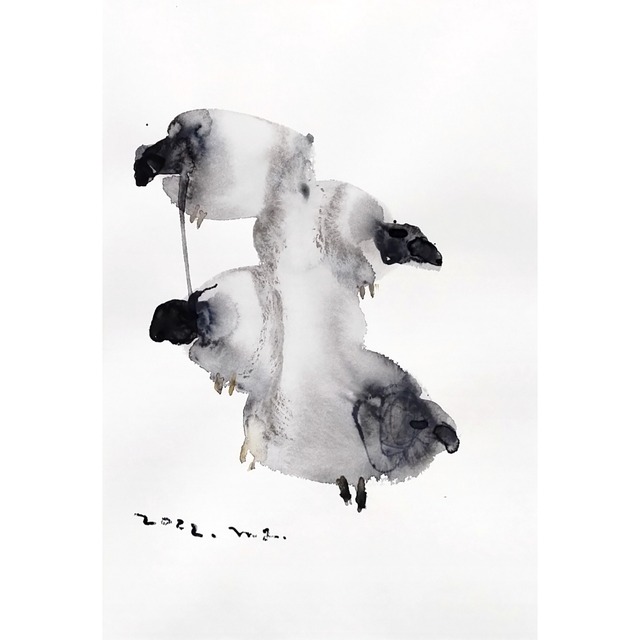 作家:佐上 まりこ 作品名:「たぶん大丈夫」 年代:2022年 技法:紙に透明水彩 イメージサイズ:37.7×25.9cm 額サイズ:52.7×41.2×2.1cm サイン:有 附属品:額 ************************************************ 佐上 まりこ Mariko Sagami 日々出会う、大胆さと繊細さを併せ持つものを制作のインスピレーションの源としている。 「言葉を綴るように絵を描く」というコンセプトの通り、作品からは物語や詩が語りかけられてくるようだ。 近年では、墨やアクリル絵具、油彩などを用いたモノクロの作品を中心に発表。 ************************************************ 縦に連なる羊たち。 左右あべこべの方向を向く気ままな4匹のようであり、群衆が一つとなって溶け合っているようにも見えます。 画家・佐上まりこは、現代社会が抱える過剰性へのほんの少しの皮肉を込めて本作を描いたと言います。 防寒対策万全のもこもこのセーターは、居心地の良い今日の暮らしの中ではもう十分(too much)と捉えることもできるでしょう。 情報、サービス、便利になりすぎるテクノロジー。 様々な物事に対して、私たちはどう向き合うべきなのかを、あたたかそうな毛に身を包んだ彼らが問いかけているのかもしれません。 水分をたっぷり含んだ絵具が滲み広がる様に、日本的な感性を感じる一作。 黒の濃淡の魅せる豊かな表情にもご注目ください。 ブラウンの木製額に、クリーム色のマットが合わせてあります。 額は、作家自らが選んだ年代物のため、よく見るとわずかな小傷やマットの微細なシミ等の経年変化がございます。 展示上気になる程度ではないと判断しておりますが、古いものの持つ特性として予めご理解くださいませ。 表面はガラス板で保護されています。 展示の際には、ご注意の上でお取り扱いください。 ご自宅のコレクションに、またはオフィスや店舗のこだわりの装いにもおすすめです。 ************************************************ 反射の都合上、ガラス板を抜いて撮影しています。 実際の色味とは若干異なっている可能性があります点、ご了承ください。 ご利用中のディスプレイ端末によっても多少の差異が生じるかと思います。 ご不明な点がありましたらお気軽にお問い合わせください。 ************************************************ International shipping is available. Please feel free to contact us via the inquiry form.