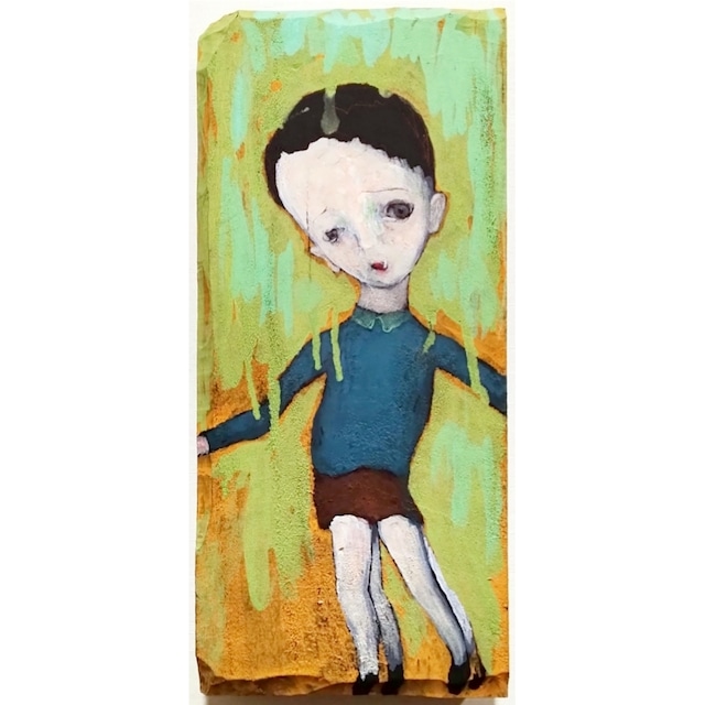 作家:丸尾 康弘 作品名:「ボク」 年代:2024年 技法:楠にアクリルガッシュ イメージサイズ:33.5×15×4.5cm サイン:有 附属品:ドローイング付専用箱 ************************************************ 丸尾 康弘 Yasuhiro Maruo 熊本県生まれ。 彫り跡が大胆に残る木肌。 楠の、なんとも心地良い香り。 丸尾康弘が生み出す彫刻は、あたたかく、遊び心があり、それでいてどこかに憂いや影を帯びる。 「自然と人間の共生」をテーマに、人物や動物をモチーフにしながらも抽象的な精神性を感じる作品を制作をしている。 ************************************************ ゆらゆらと漂うかのように。 描かれた少年ボクは、今を生きる子どもたちを表す普遍的なイメージです。 予期せぬ自然災害や、思い通りにならないことばかりの現代社会を歩まざるを得ない彼らに、丸尾康弘は一種の「力」として様々な異形の造形要素を取り入れます。 未来を背負う彼らを陰ながら支える存在は四本の足に、「不動明王」から引用した瞳や牙も加えられ、愛らしさと歪さが共存する神聖な存在感が生まれました。 本作は、楠の板にアクリルガッシュで描いた作品です。 厚みのある板の側面にも彩色が施され、立体と平面両方の要素を楽しめるところが魅力。 荒々しい木材の表情をそのまま活かした表現には、抗えない自然の力を受け入れ、共に生きていくという作家の創作テーマが映し出されています。 裏面は、縁を残して溝をくり抜いた仕上げとなっております。 棚に立て掛けたり、ピンやフックに縁部分を引っ掛けて壁面展示することが可能です。 額装ご希望の場合には、お気軽にご相談ください。 作家によるドローイングが描かれた専用箱が附属します。 作品と併せてお楽しみくださいませ。 ************************************************ 撮影の都合上、実際の色味とは若干異なっている可能性があります点、ご了承ください。 ご利用中のディスプレイ端末によっても多少の差異が生じるかと思います。 ご不明な点がありましたらお気軽にお問い合わせください。 ************************************************ International shipping is available. Please feel free to contact us via the inquiry form.