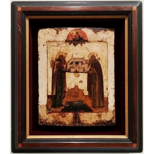 国:ロシア 年代:18-19世紀頃 技法:木に彩色 イメージサイズ:11.1×8.8×0.8cm 額サイズ:27.1×24.8×5cm 附属品:額 ************************************************ ロシアの聖人、聖サワッティーと弟子の聖ゾシマを描いた小型イコンです。 15世紀、二人は北ロシアにソロヴェツキー修道院を建立します。 修道院は16世紀に至るまで白海沿いを中心に領土を広げ、様々な製品の加工と販売、さらには貿易を展開しながら政治経済の拠点として華咲かせ、ロシアで最も影響力のある聖地へと成長を遂げました。 16世紀以降は石造りの堅牢な外壁を活かした要塞に、また20世紀に修道院が閉鎖されてからはソビエト連邦の強制収容所に姿を変え、多くの人々が命を落とす悲しい歴史が重ねられたという側面も併せ持ちます。 修道僧の衣を着てソロヴェツキー修道院を掲げ持つ伝統的な図像は古くから人気があり、修道院内に設けられたイコン工房にて多くの板絵が生まれました。 本作もまた、過去の作例を忠実に踏襲した構図です。 極めて小さな画面に、祈りを捧げるような慎重な筆運びで映し出された場面。 大型イコンと比べ親しみやすく、旅先に携帯したりと身近なお守りのような存在として大切に所有されていたものと思われます。 非常に古い板絵のため、木材の小傷や亀裂、彩色のスレや剥落等の経年変化が見られます。 彫り飾りのあるダークブラウンの木製額に、ワインレッドのベルベットマットを合わせた仕上がりです。 額は、イコンの世界観を元に制作した、嶋田製作所による上質なオリジナルフレームです。 ************************************************ 反射の都合上、アクリル板を抜いて撮影しています。 また、掲載画像には額装前に撮影したものも含まれます。 実際の色味とは若干異なっている可能性があります点、ご了承ください。 ご利用中のディスプレイ端末によっても多少の差異が生じるかと思います。 ご不明な点がありましたらお気軽にお問い合わせください。 ************************************************ International shipping is available. Please feel free to contact us via the inquiry form.