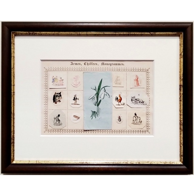 国:フランス 年代:1800年代後半 技法:紙 シートサイズ:15.7×23cm 額サイズ:28.6×36×2.1cm 附属品:額 ************************************************ 19世紀後半のフランス。 王侯貴族が家柄を示すために用いた紋章や、二つ以上の文字を組み合わせたモノグラム、書簡や文書を飾る花文字や蝋印などを台紙に貼りつけた『紋章、花文字、モノグラム(Armes, Chiffres, et Monogrammes)』というアルバム状の書物からの一枚です。 紋章やモノグラムのデザインはコレクターズアイテムとしても当時から人気が高く、生涯をかけて地道に蒐集した力作のアルバムも多く残されています。 こちらのシートに見られるのは、花、猫やニワトリ、昆虫や人物像など、本来の趣旨とはやや異なる珍しい紙片。 その昔の人物がその都度見つけた様々なイラストが、切り取り方にも変化を付けて丁寧に枡目に並べられています。 それぞれの絵柄が醸し出す可愛らしく味わい深い雰囲気をお楽しみくださいませ。 非常に長い年月を重ねたもののため、紙のヤケやシミ、ヨレなどのエイジングが見られます。 アンティークペーパーならではの風合いとして予めご理解ください。 面金加工のあるブラウンの額を合わせました。 こだわりのアンティークコレクションや、個性的な空間演出のアイテムに、いかがでしょうか。 ************************************************ 反射の都合上、アクリル板を抜いて撮影しています。 実際の色味とは若干異なっている可能性があります点、ご了承ください。 ご利用中のディスプレイ端末によっても多少の差異が生じるかと思います。 ご不明な点がありましたらお気軽にお問い合わせください。 ************************************************ International shipping is available. Please feel free to contact us via the inquiry form.