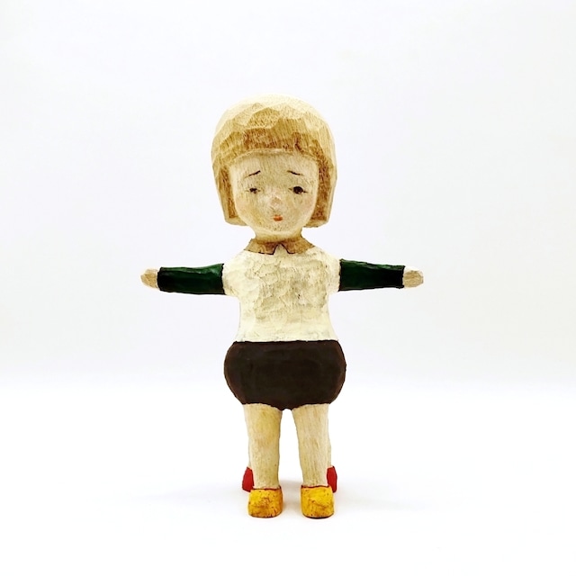 作家:丸尾 康弘 作品名:「ハル」 年代:2024年 技法:楠・彩色 サイズ:11.6×8.3×3.3cm サイン:有 附属品:ドローイング付専用箱 ************************************************ 丸尾 康弘 Yasuhiro Maruo 熊本県生まれ。 彫り跡が大胆に残る木肌。 楠の、なんとも心地良い香り。 丸尾康弘が生み出す彫刻は、あたたかく、遊び心があり、それでいてどこかに憂いや影を帯びる。 「自然と人間の共生」をテーマに、人物や動物をモチーフにしながらも抽象的な精神性を感じる作品を制作をしている。 ************************************************ 両手を横に大きく広げて。 バランスを取るような、あるいは「ここから先はダメ」ととおせんぼをする仕草にも。 幼くも今を精一杯生きる姿に、放っておけないいじらしさを感じます。 困難が多いであろう未来を歩む子どもたち。 健気で純真な少女ハルは、そうした彼らを表す普遍的・抽象的なイメージです。 不安をかき消して元気づけてくれそうなカラフルな色遣いが印象的。 ハルを背後からそっと支える人々の存在が、四本の足によって示唆されています。 木を彫り進めて生まれた、愛らしさと歪さが溶け合う一作。 丁寧な彩色と趣溢れるマチエールも魅力です。 作家によるドローイングが描かれた専用箱が附属します。 作品と併せてお楽しみくださいませ。 ************************************************ 撮影の都合上、実際の色味とは若干異なっている可能性があります点、ご了承ください。 ご利用中のディスプレイ端末によっても多少の差異が生じるかと思います。 ご不明な点がありましたらお気軽にお問い合わせください。 ************************************************ International shipping is available. Please feel free to contact us via the inquiry form.