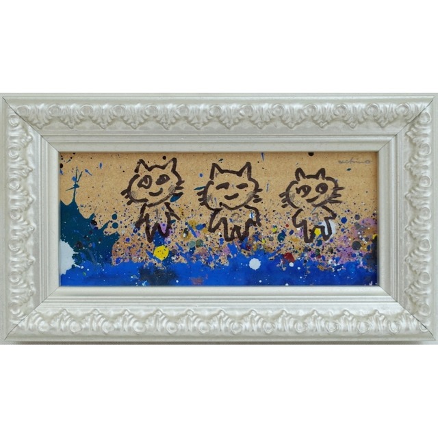 作家:内野 隆文 作品名:「ザ☆キャッツ」 年代:2025年 技法:段ボールにアクリル・ペン・鉛筆 イメージサイズ:5×10.8cm 額サイズ:7.2×12.7×2cm サイン:有 附属品:ミニ額 ************************************************ 内野 隆文 Takafumi Uchino 嫌なことがあった日。 美しい音楽を聴いた日。 知らなかったことを知った日。 そのとき感じた強い気持ちも、 やがて薄れてバラバラになり、 色褪せた破片となって青暗い泉の底に降り積もっていく。 遠い思い出に流れる音楽のようにゆっくりとそのカケラが集まって、 ポツリポツリと水面に浮かんでくる。 意味を持たなかったカケラが、意味を持たない絵らしきものとなって。 ************************************************ 「1、2、3」。 お腹に番号をつけた猫たちが3匹。 何かイタズラを思いついたような楽しそうな笑みを浮かべ、ずらりと整列しています。 パノラマ的な横長の段ボール片に描いたユニークな絵画作品です。 画家がライフワークとして取り組むイマジネーションを掻き立てられる抽象空間と、ついつい顔がほころんでしまうキュートなドローイングが融合した一作。 クラフト色の画面に勢いよく飛び散る絵具の粒子が、角度によってキラキラとまばゆく輝きます。 美しい彫りのあるシルバーのフレームは、大きな額を作る時に残ってしまった端材を使って作られた「ミニ額」です。 壁掛けが基本ですが、棚などに立て掛けて飾ることもできます。 ご自宅やオフィス、ショップのコンパクトなスペースの彩りに、またはアート好き・猫好きの方への贈り物にもおすすめです。 ************************************************ 反射の都合上、アクリル板を抜いて撮影しています。 実際の色味とは若干異なっている可能性があります点、ご了承ください。 ご利用中のディスプレイ端末によっても多少の差異が生じるかと思います。 ご不明な点がありましたらお気軽にお問い合わせください。 ************************************************ International shipping is available. Please feel free to contact us via the inquiry form.