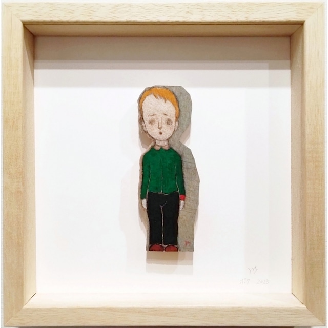 作家:丸尾 康弘 作品名:「ボク」 年代:2025年 技法:楠・彩色 イメージサイズ:12×4.5cm 額サイズ:21.9×21.9×3.5cm サイン:有 附属品:額 ************************************************ 丸尾 康弘 Yasuhiro Maruo 熊本県生まれ。 彫り跡が大胆に残る木肌。 楠の、なんとも心地良い香り。 丸尾康弘が生み出す彫刻は、あたたかく、遊び心があり、それでいてどこかに憂いや影を帯びる。 「自然と人間の共生」をテーマに、人物や動物をモチーフにしながらも抽象的な精神性を感じる作品を制作をしている。 ************************************************ 「木彫スケッチ」シリーズより。 彫刻家・丸尾康弘は、木彫の制作に取り掛かる際、まず四角い木材の正面と右側面に下絵を描きます。 本シリーズは、木を彫り進めていき最終的に切り落とされたこの下絵部分に彩色をした作品です。 不安げな表情で佇むボク。 それは、作家自身の少年時代の姿であり、今を生きる子どもたちを表す普遍的なイメージです。 色鮮やかな洋服が印象的。 自然災害をはじめ、様々な苦難が待ち受ける子どもたちの未来に、明るく前向きな彩りを添えてあげたいという願いが表れているように感じます。 かたちを探る線描、影を思わせる余白、木肌の風合いを残した彩色など、スケッチならではの即興性が魅力。 彫刻としての命を吹き込まれる一歩手前の瞬間を切り取った、立体と平面の狭間を思わせる一作です。 幅1.4cmのシンプルな木製ボックス額に、作品を土台から少し浮かせる仕様でセットされています。 壁掛けの他、背面のスタンドを用いて卓上に飾っていただくことも可能です。 ************************************************ 反射の都合上、アクリル板を抜いて撮影しています。 実際の色味とは若干異なっている可能性があります点、ご了承ください。 ご利用中のディスプレイ端末によっても多少の差異が生じるかと思います。 ご不明な点がありましたらお気軽にお問い合わせください。 ************************************************ International shipping is available. Please feel free to contact us via the inquiry form.
