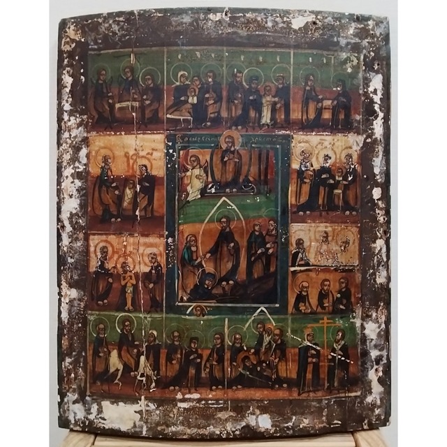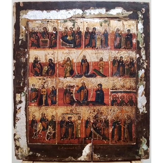 -     復活大祭と十二大祭 東欧イコン ¥95,000 SOLD OUT 国:東ヨーロッパ 年代:18-19世紀頃 技法:木に彩色 イメージサイズ:35.4×31×1.9cm 附属品:無 ************************************************ 正教会暦によって定められた祝祭日を描いたイコンです。 キリストが説いた教えを記憶し、日々教徒たちが信仰を深める目的のため、古くから描かれ続けてきた祝祭のイコン。 それぞれの事跡を独立して図像化したものが一般的ですが、このように一枚の板に主要な祭日を網羅する作例も多く見られ、正教会における礼拝行事で好んで用いられました。 中央には「キリストの復活」と「キリストの黄泉降り」を上下に組み合わせた「復活大祭」、その周囲を取り囲むのは正教会が重要視する祭日を集めた「十二大祭」です。 一つひとつの枡目に、聖なる場面が伝統的な表現を踏襲しながら緻密に描かれています。 時と共に落ち着いた発色へと変化した画面ですが、かすかに覗く煌びやかな色彩からは、制作当初の絢爛な仕上がりを想像させられます。 枡目の境界や周縁に見られる、点や円を打つような意匠が独特です。 非常に古い板絵のため、木材の歪みや欠け、彩色の亀裂や剥落等の経年変化が見られます。 板の上下の側面には反りを防ぐための桟が取り付けられています。 一般的な桟の入れ方とはやや異なる仕様は、イコンを軽量化するための工夫だったのかもしれません。 ************************************************ 撮影の都合上、実際の色味とは若干異なっている可能性があります点、ご了承ください。 ご利用中のディスプレイ端末によっても多少の差異が生じるかと思います。 ご不明な点がありましたらお気軽にお問い合わせください。 ************************************************ International shipping is available. Please feel free to contact us via the inquiry form.
