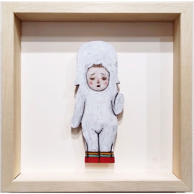 作家:丸尾 康弘 作品名:「ひつじっこ(うん)」 年代:2026年 技法:楠・彩色 イメージサイズ:14.9×6.6cm 額サイズ:21.9×21.9×3.5cm サイン:有 附属品:額 ************************************************ 丸尾 康弘 Yasuhiro Maruo 熊本県生まれ。 彫り跡が大胆に残る木肌。 楠の、なんとも心地良い香り。 丸尾康弘が生み出す彫刻は、あたたかく、遊び心があり、それでいてどこかに憂いや影を帯びる。 「自然と人間の共生」をテーマに、人物や動物をモチーフにしながらも抽象的な精神性を感じる作品を制作をしている。 ************************************************ 「木彫スケッチ」シリーズより。 彫刻家・丸尾康弘は、木彫の制作に取り掛かる際、まず四角い木材の正面と右側面に下絵を描きます。 本シリーズは、木を彫り進めていき最終的に切り落とされたこの下絵部分に彩色をした作品です。 あたたかな衣とカラフルな足元に包まれて、そっと前を向くひつじっこ。 その愛らしい姿は、困難の多い未来を歩む子どもたちを投影するイメージであり、か弱い彼らに授ける一種の「力」として、様々な異形の要素が取り入れられています。 中でもこちらは、神社の狛犬・獅子や寺社の仁王像に見られる「阿吽(あ・うん)」の造形を加えた作品です。 口を開ける「阿形」と閉じる「吽形」の一対で、宇宙の始まりと終わり、物ごとの真理や森羅万象を示すとされ、聖域を守る番人としての役目を司る「阿吽」。 口元を閉じた「吽形」のひつじっこには、すべてを受け入れて包み込む、"静" のイメージが漂います。 かたちを探る線描、木肌の風合いを残す彩色など、スケッチならではのスピード感が魅力。 彫刻としての命を吹き込まれる一歩手前の瞬間を切り取った、立体と平面の狭間を思わせる一作です。 幅1.4cmのシンプルな木製ボックス額に、作品を土台から少し浮かせる仕様でセットされています。 壁掛けの他、背面のスタンドを用いて卓上に飾っていただくことも可能です。 ************************************************ 反射の都合上、アクリル板を抜いて撮影しています。 実際の色味とは若干異なっている可能性があります点、ご了承ください。 ご利用中のディスプレイ端末によっても多少の差異が生じるかと思います。 ご不明な点がありましたらお気軽にお問い合わせください。 ************************************************ International shipping is available. Please feel free to contact us via the inquiry form.