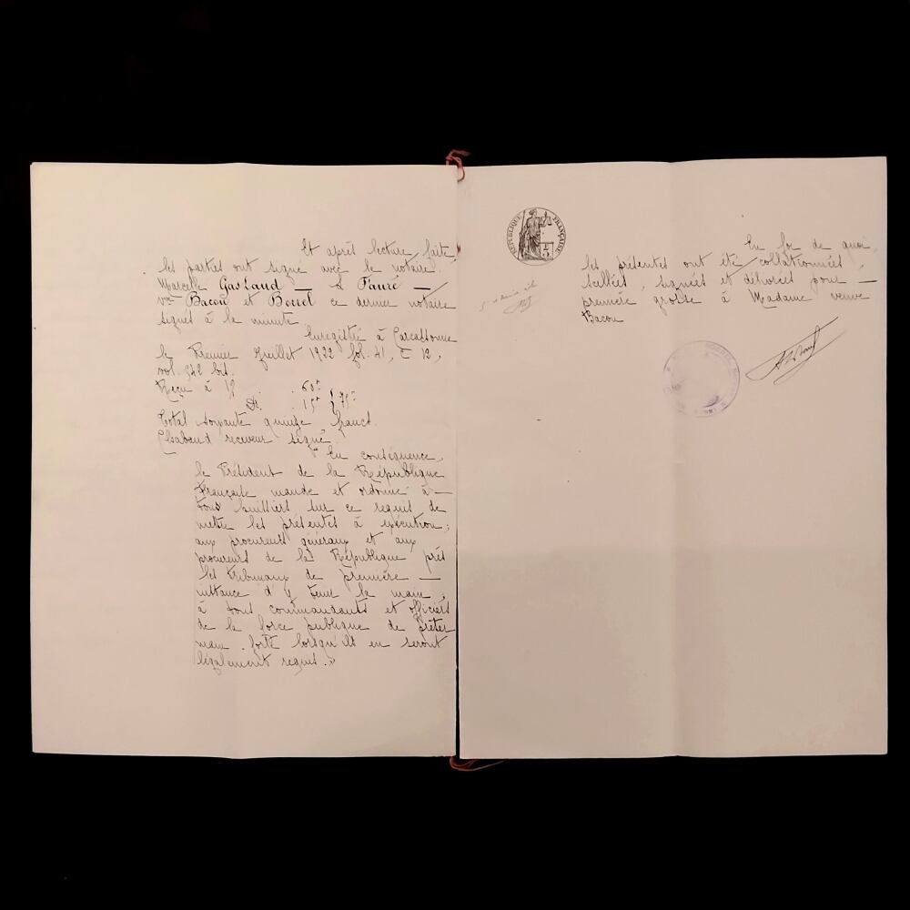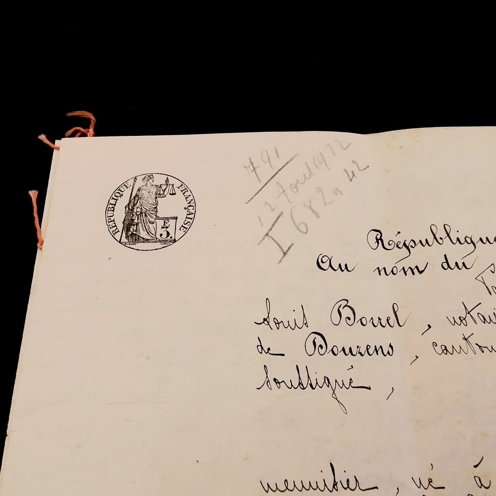 重要な手続きや契約を結ぶ際の仲介や助言を行うことができる職業で、こちらの古文書の末尾にもオード県ドゥーズの公証人の名が記されています。