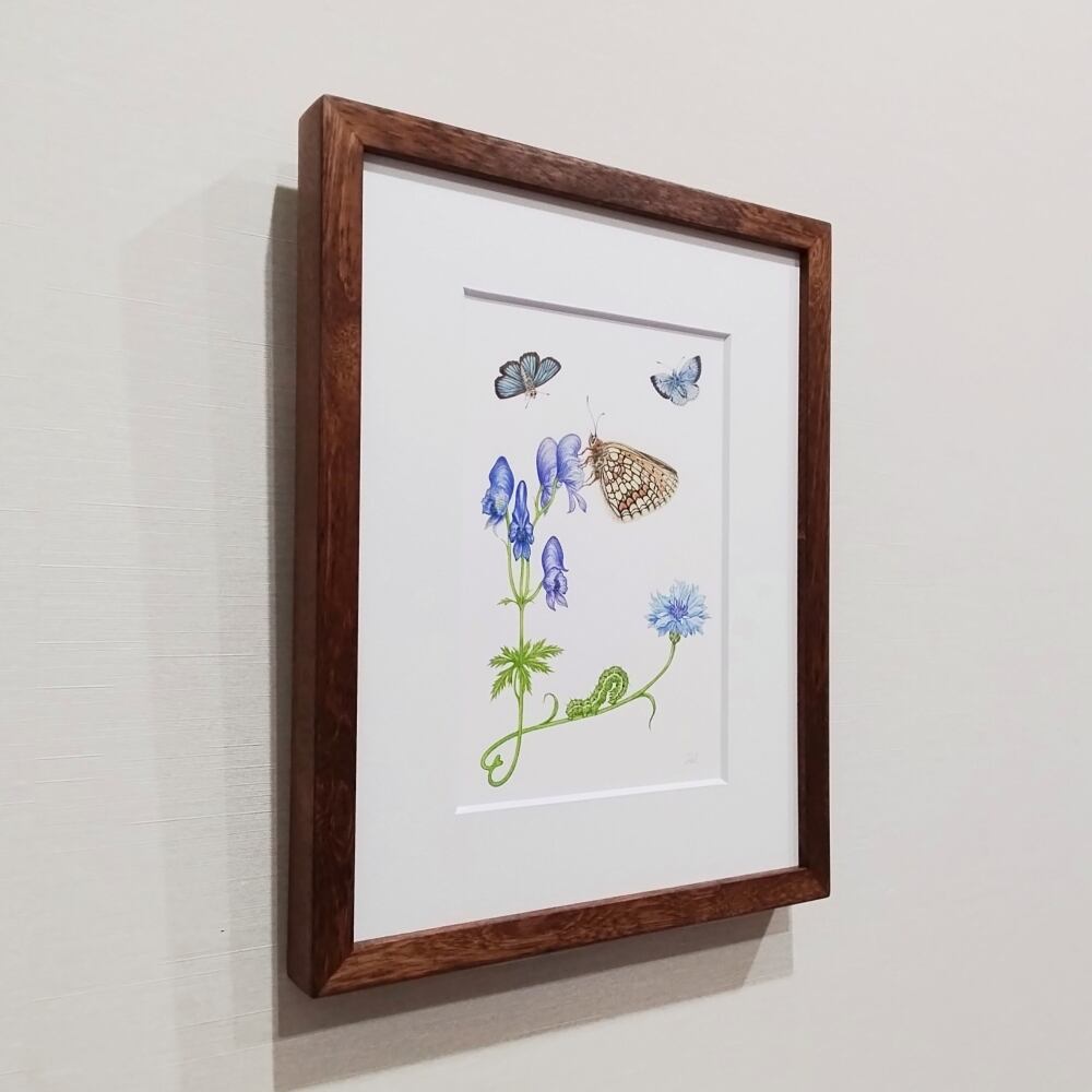 花と蝶を配した、いにしえの博物図譜を思わせる作品。