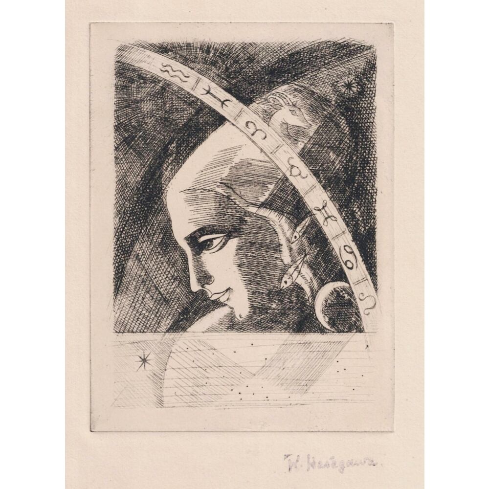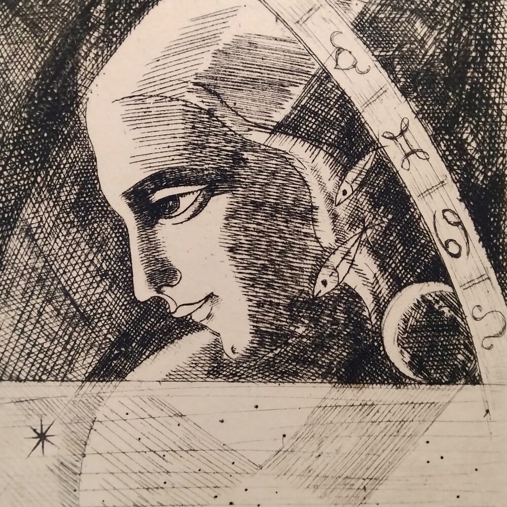 角を持つ動物や魚、占星術のモチーフが、人物と溶け合うかのように浮かび上がっています。