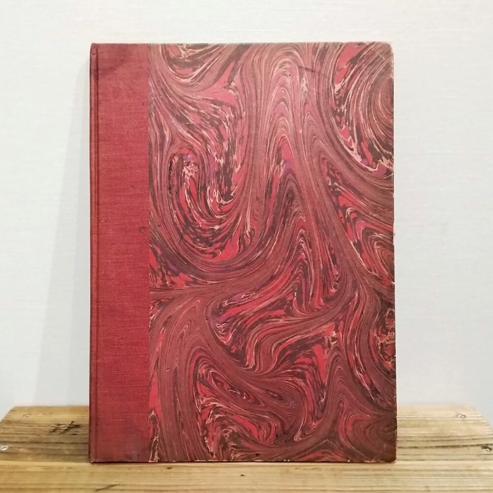 赤いマーブル紙に布背表紙を添えたエレガントな装丁が目を引く大型本。