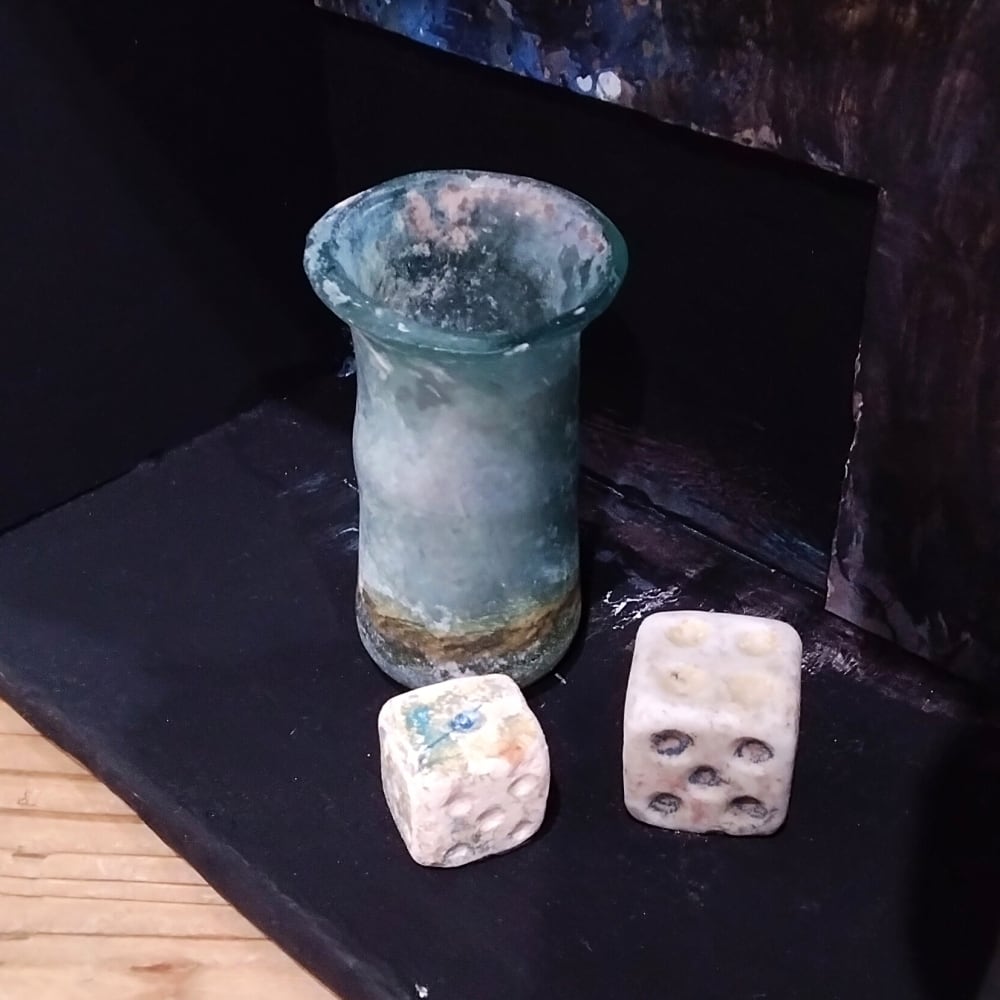 鈍く光るガラス瓶と古びたサイコロがふたつ、まるで何かの暗号かのように置かれた室内。