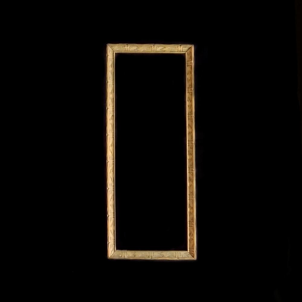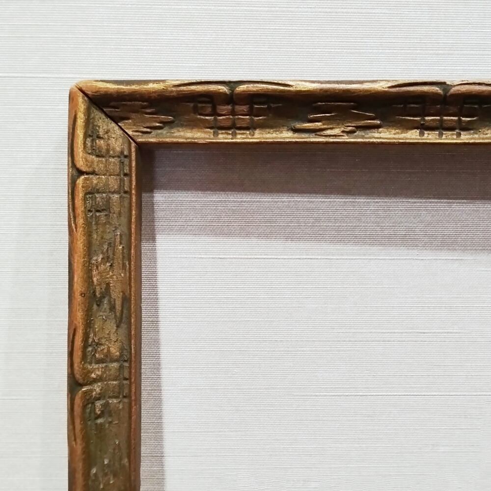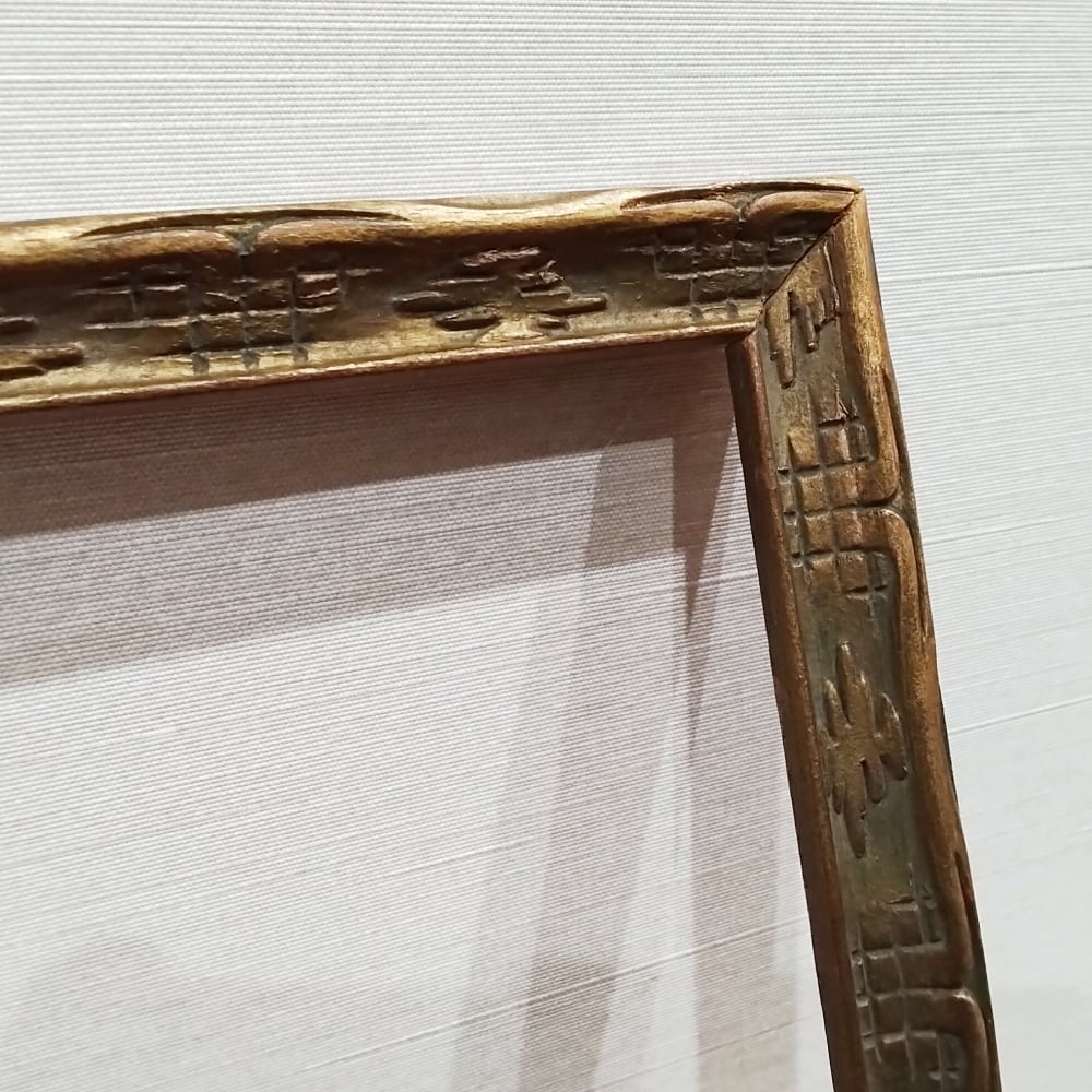 華奢な木枠にはアール・デコ調の幾何学パターンが並び、やや緑味のあるゴールドカラーが表面を彩っています。