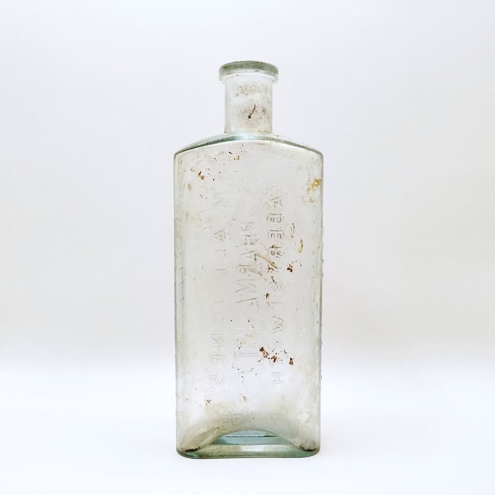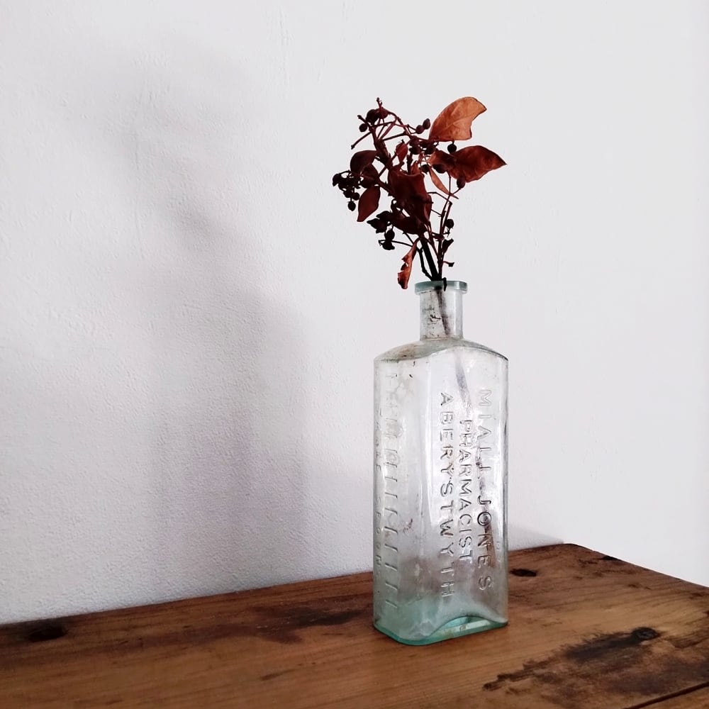 薄緑色のガラスの表面にエンボスで刻まれているのは、「マイアル・ジョーンズ」というウェールズの港町・アベリストウィスの薬剤師の名前です。