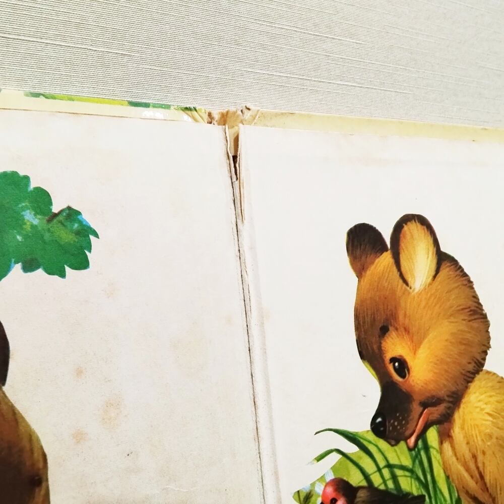 50年以上もの年月を経た古い絵本のため、随所にヤケやシミ、イタミや破れ、落としきれない汚れ等の経年変化が生じています。