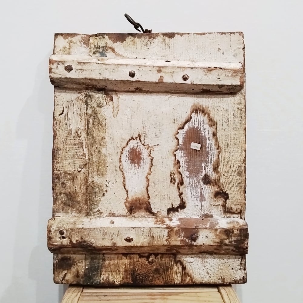 上部に展示用の金具が取り付けられていますが、土台となる木材が重量のあるイコンを支える耐久性を保っているかどうか不明のため、別の方法での展示をおすすめいたします。