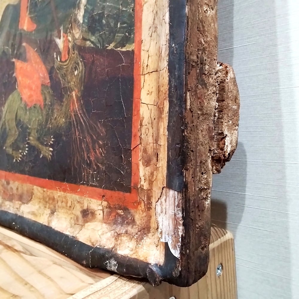 非常に古い板絵のため、木材の欠けや虫喰い跡、彩色の亀裂や剥落等の激しい経年変化が見られます。