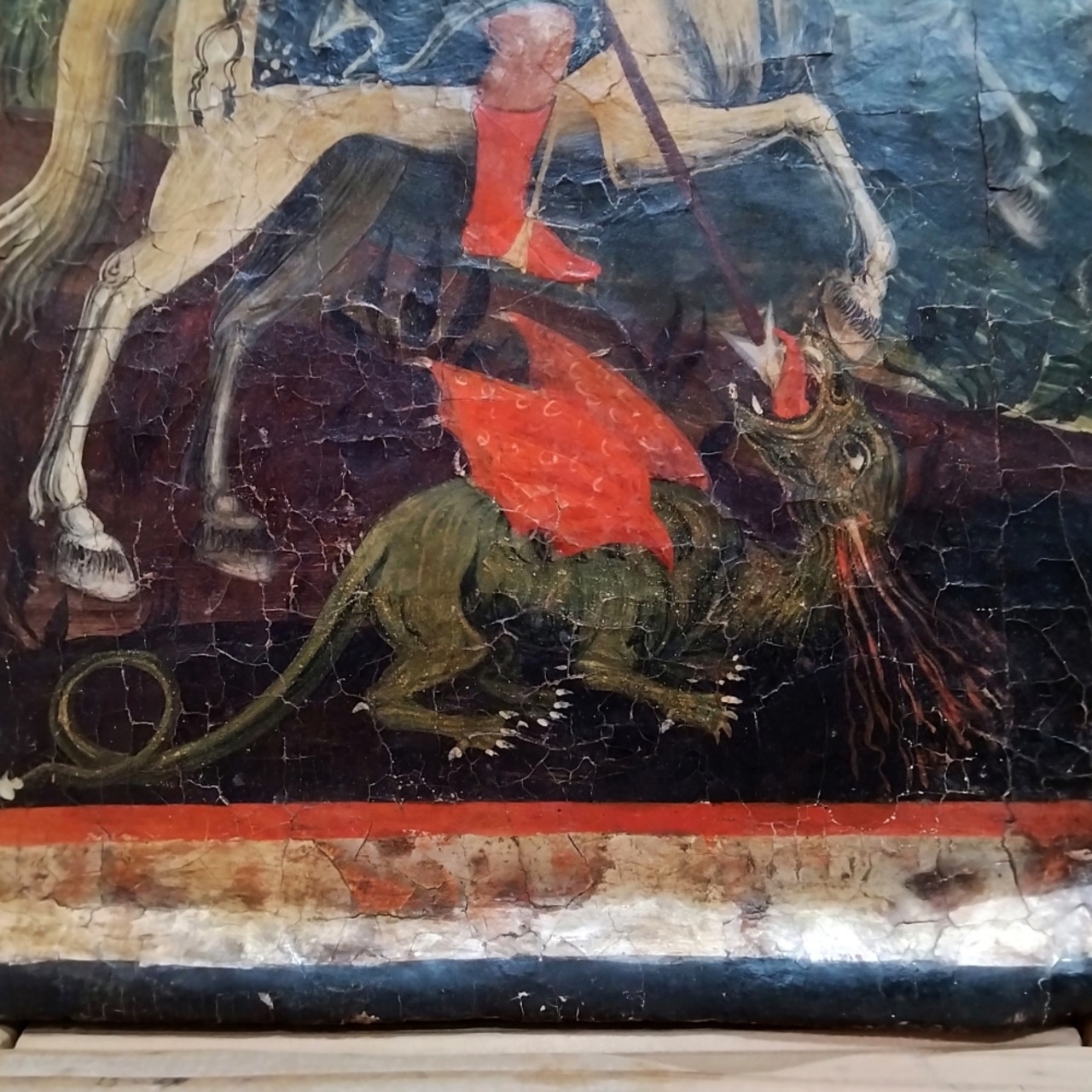 本作では、ゲオルギウスが馬に跨り、十字架のついた槍で竜を突く瞬間が、金をふんだんに用いた煌びやかな色彩で描かれています。