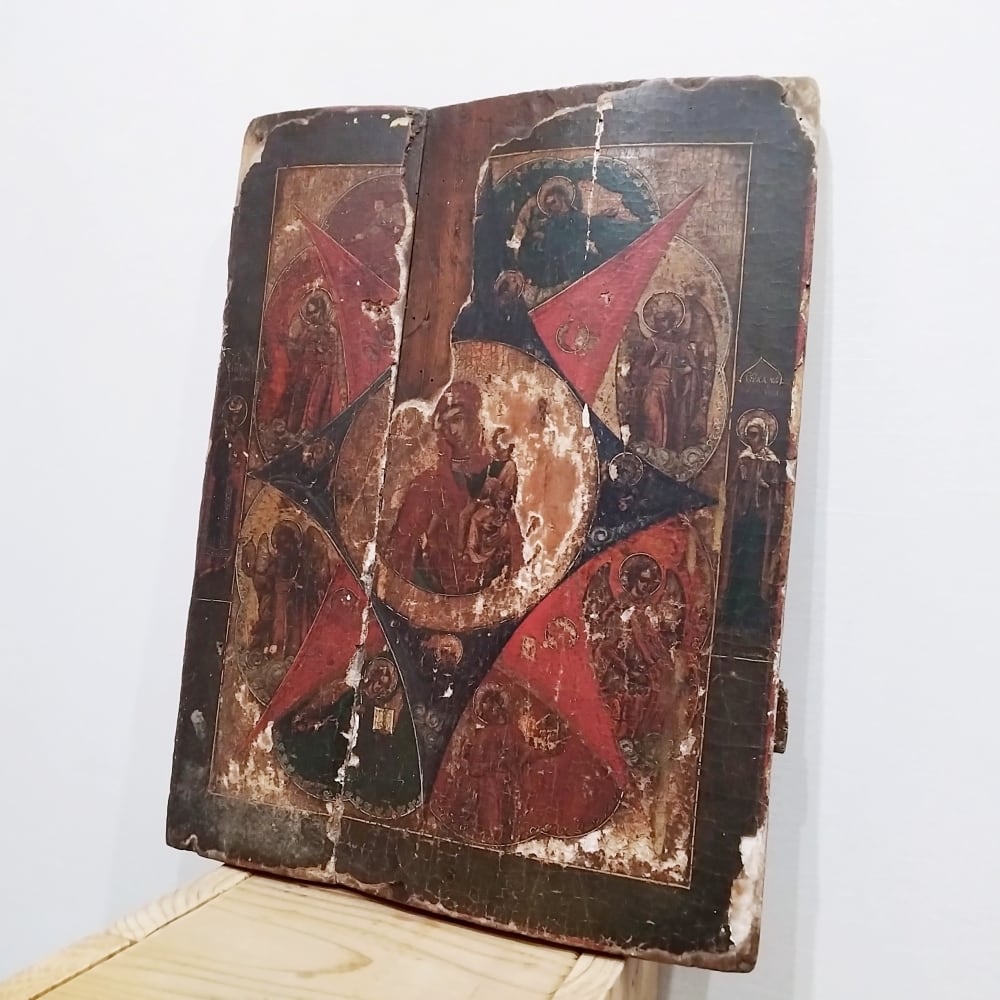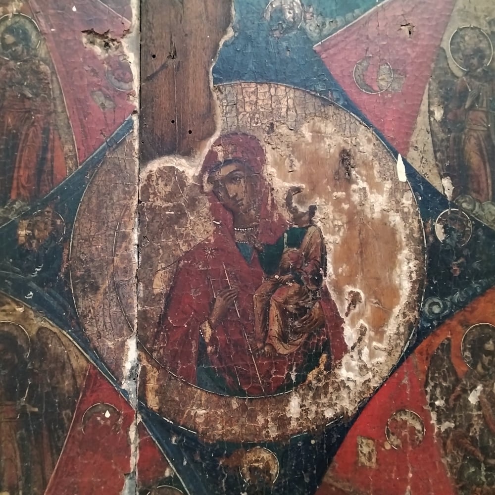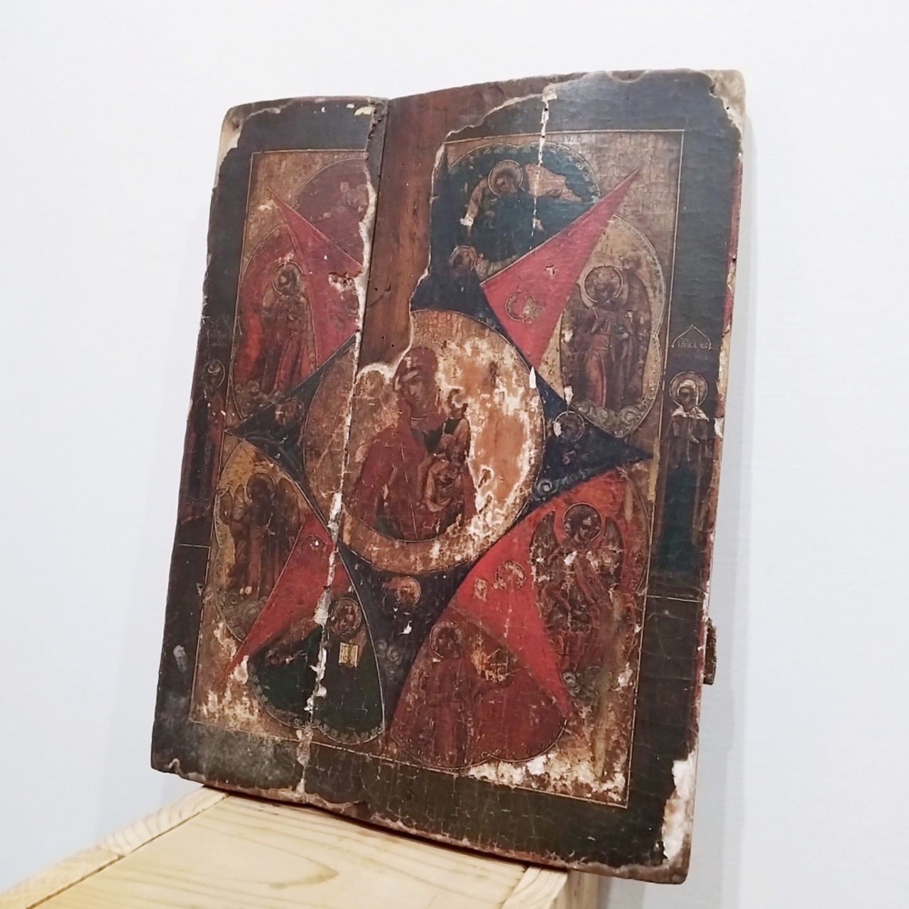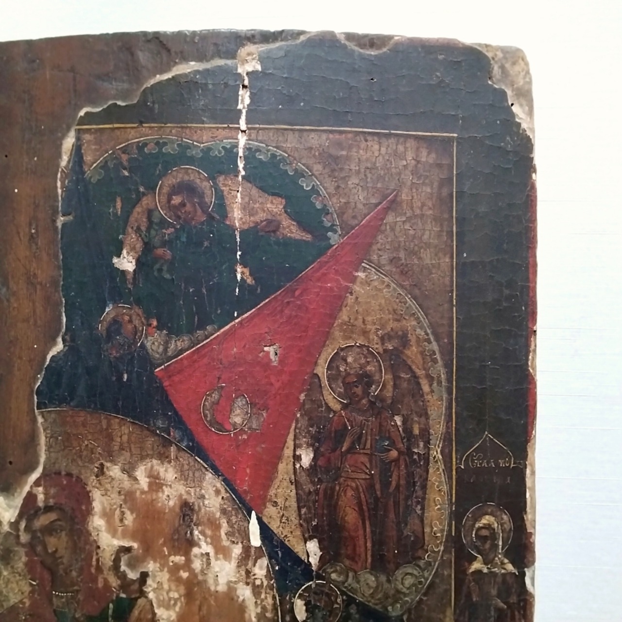 非常に古い板絵のため、木材の欠けや歪み、虫喰い跡、彩色の亀裂や剥落等の経年変化が見られます。