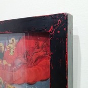 赤いアクセントカラーが印象的な黒い額に入っています。