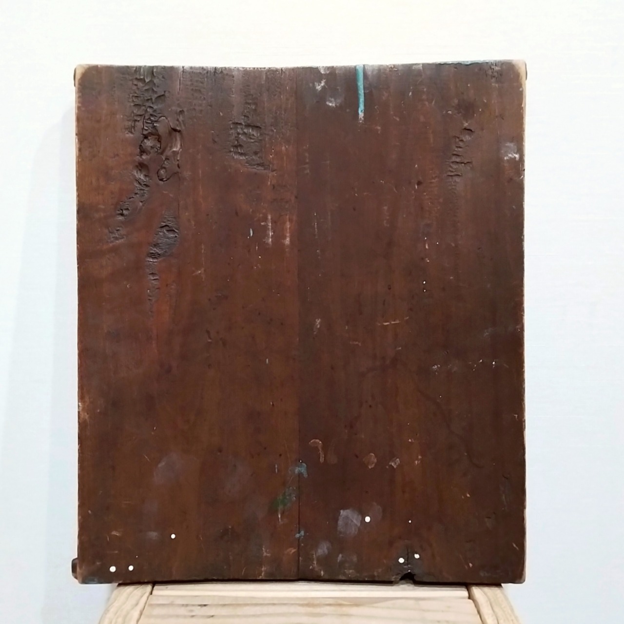 非常に古い板絵のため、木材の歪みや欠け、虫喰い跡、彩色の亀裂や剥落等の経年変化が見られます。