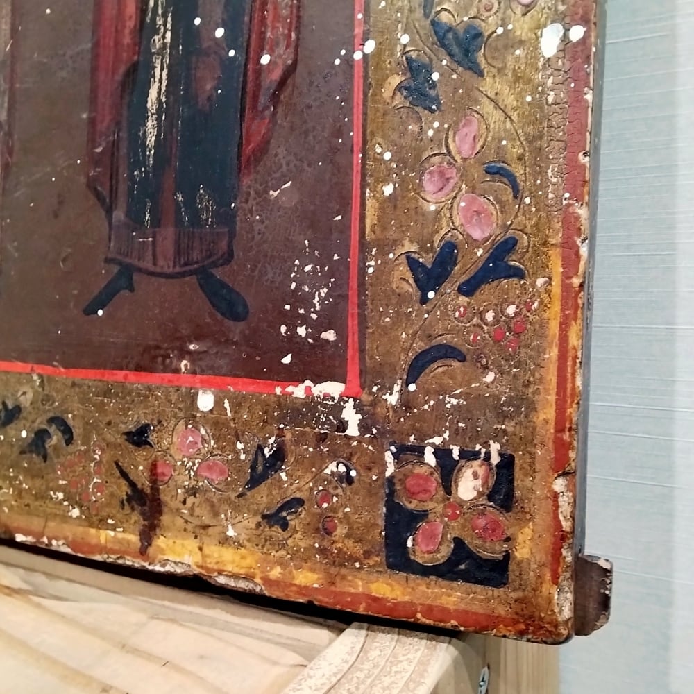 画面に白や水色の塗料が飛び散る独特の姿は、イコンが教会や修道院などではなく、個人の住居に置かれていたことを示唆するものでしょうか。