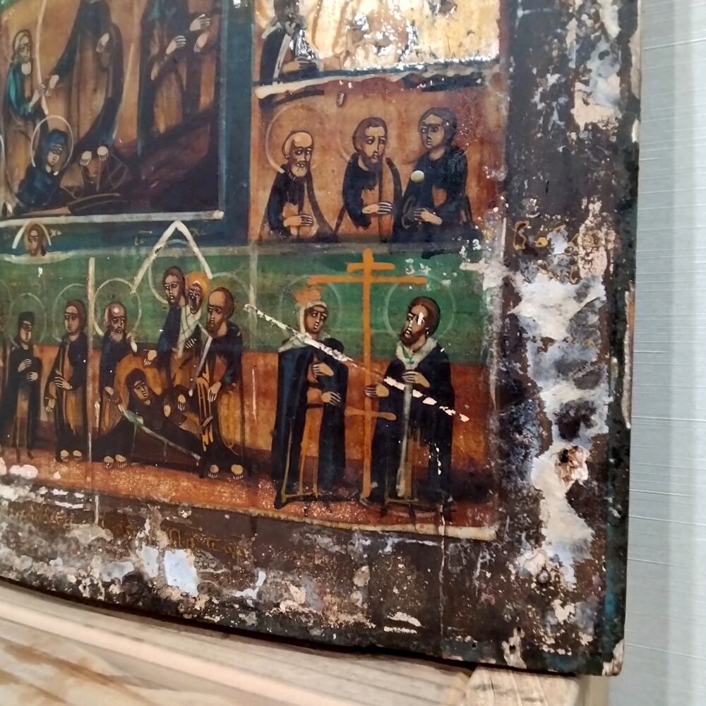 かつてリザと呼ばれるイコン保護用の金属製の覆い、もしくは額装がほどこされ、後世に撤去された際に生じたものかもしれません。