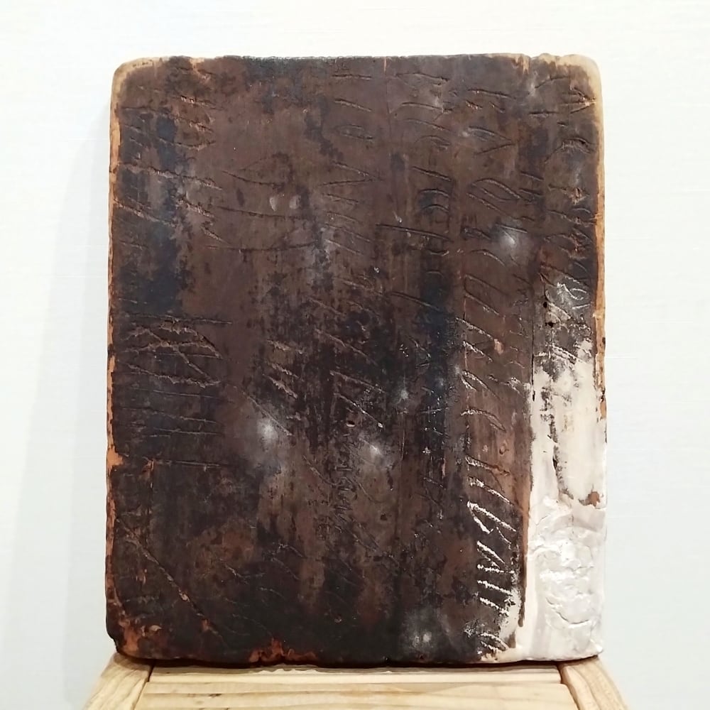 背面には板の欠けをパテで埋めた痕跡と、判別はできませんが文字の彫刻がございます。