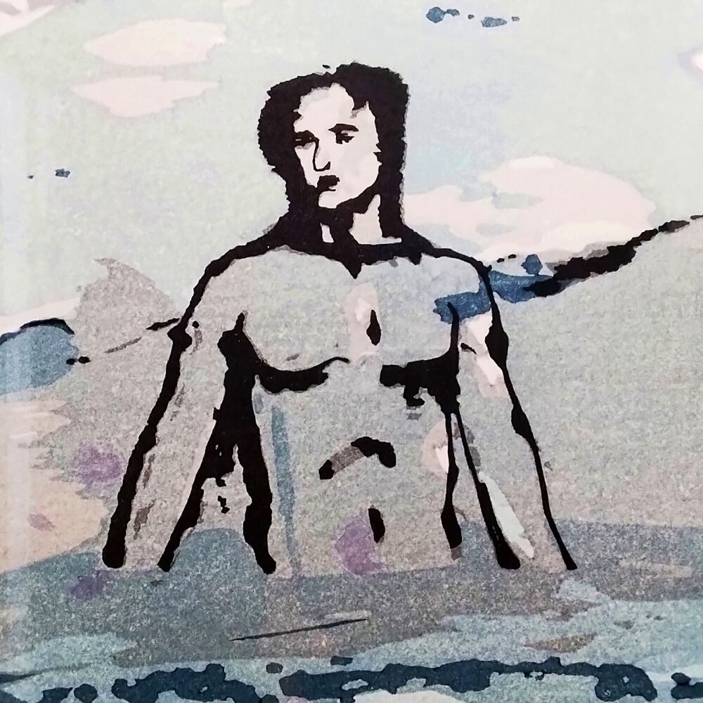 本作に描かれた、ひとり淡々と水をゆく人物もまた、波に揺れる水と同化しているかのように見えます。