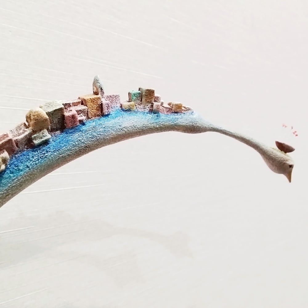 小舟で進んだその先には、一羽の鳥が空を翔け、街の風景や人々の営みを静かに見渡しています。