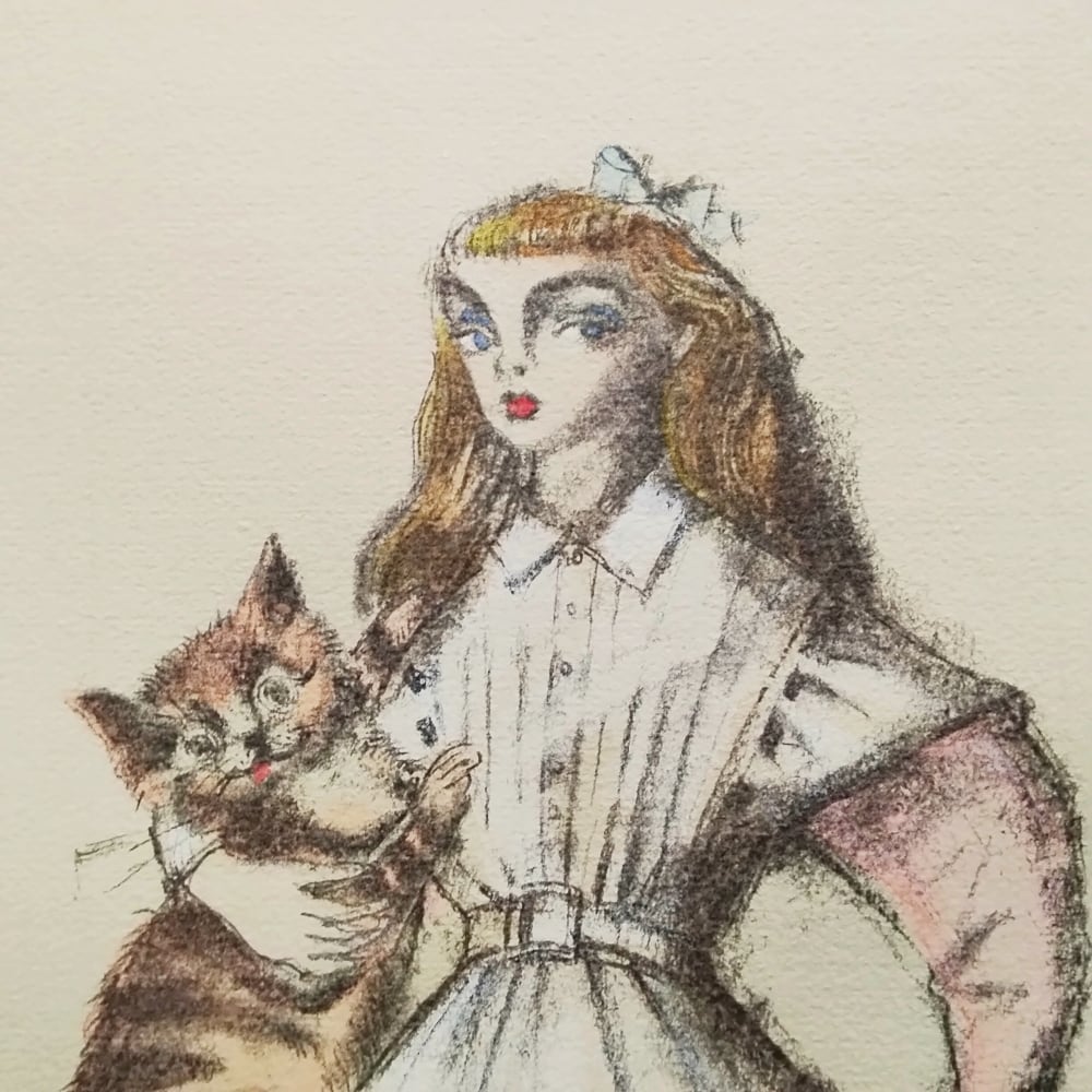 本作のアリスは、大きな猫を腕に抱き、意味ありげな眼差しでこちらを見つめています。