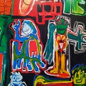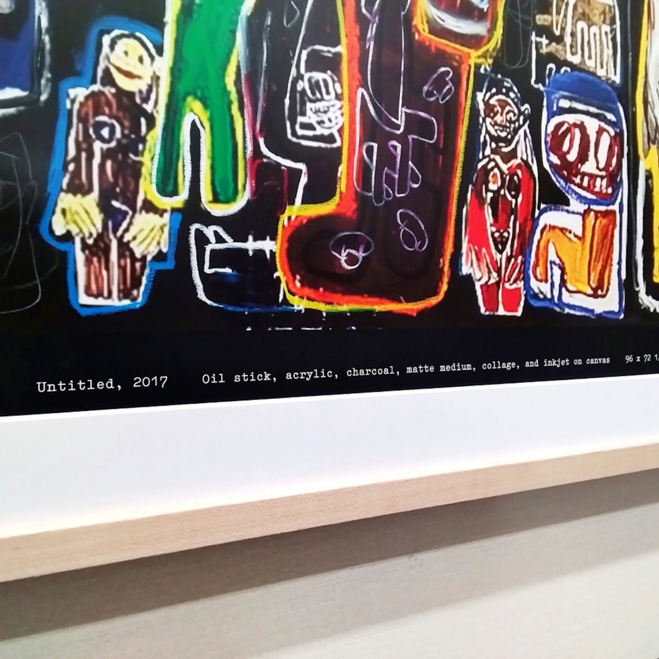 プリンスのスケッチブックからスキャンし、キャンバス上に複写されたイメージに、オイルスティックやアクリル絵の具で描画を施したおびただしい数の人物像が、黒い背景を埋め尽くしています。