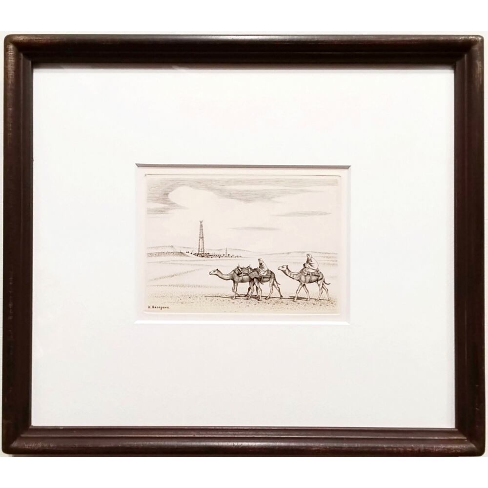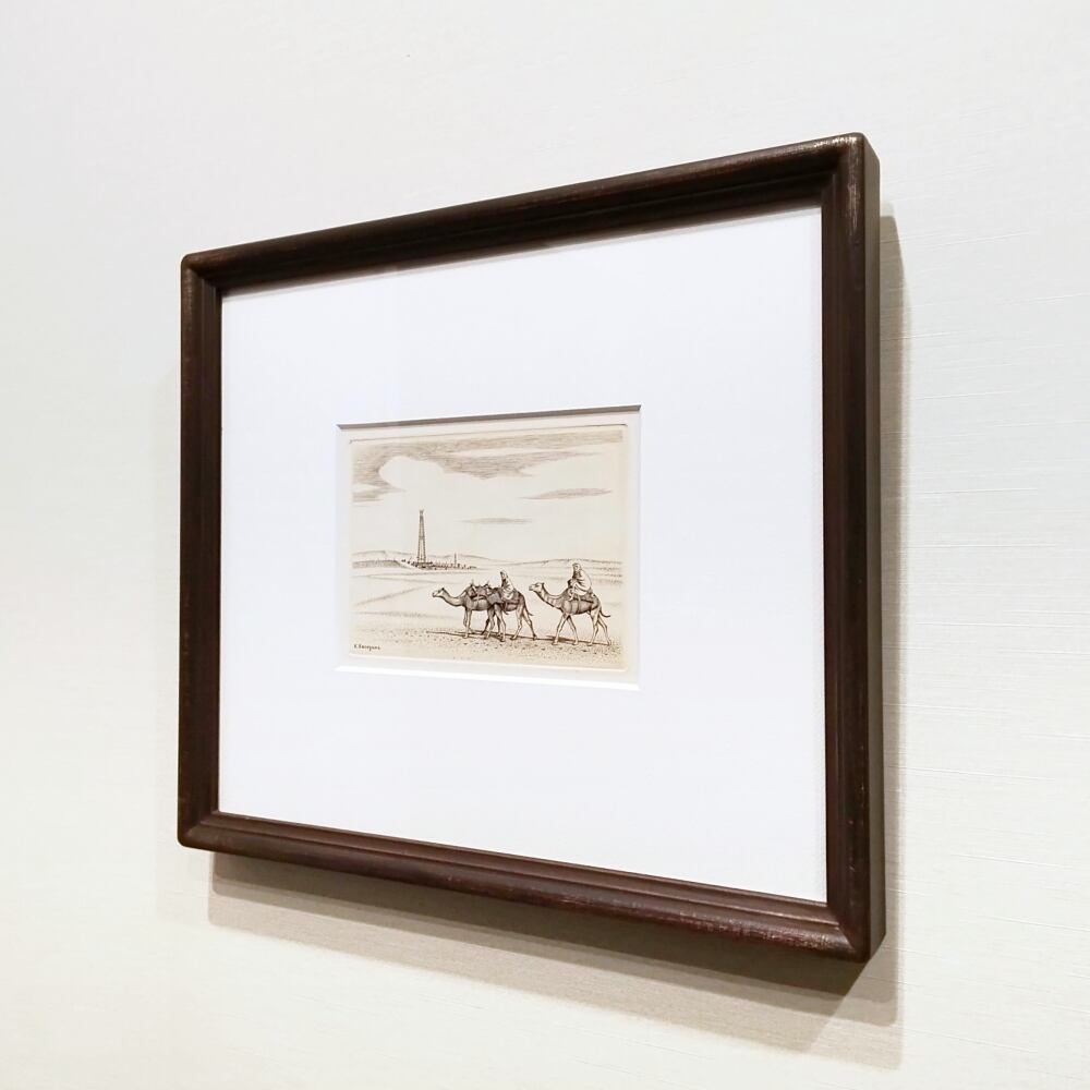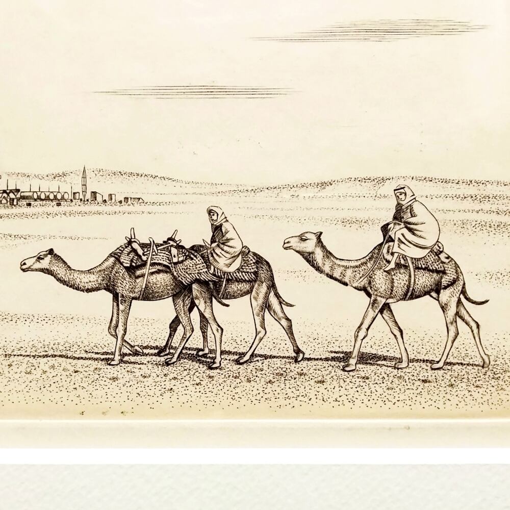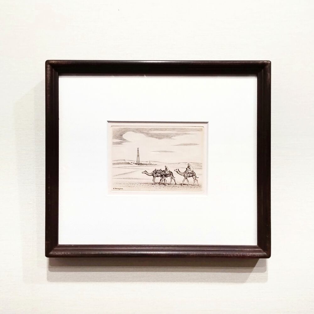 極めて精緻な線描によって、ラクダたちの足音や砂漠を撫でる乾いた風さえも感じられそうな秀作です。
