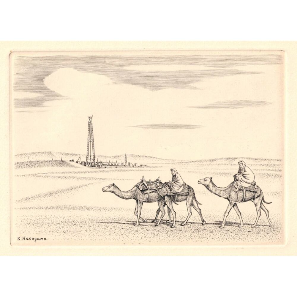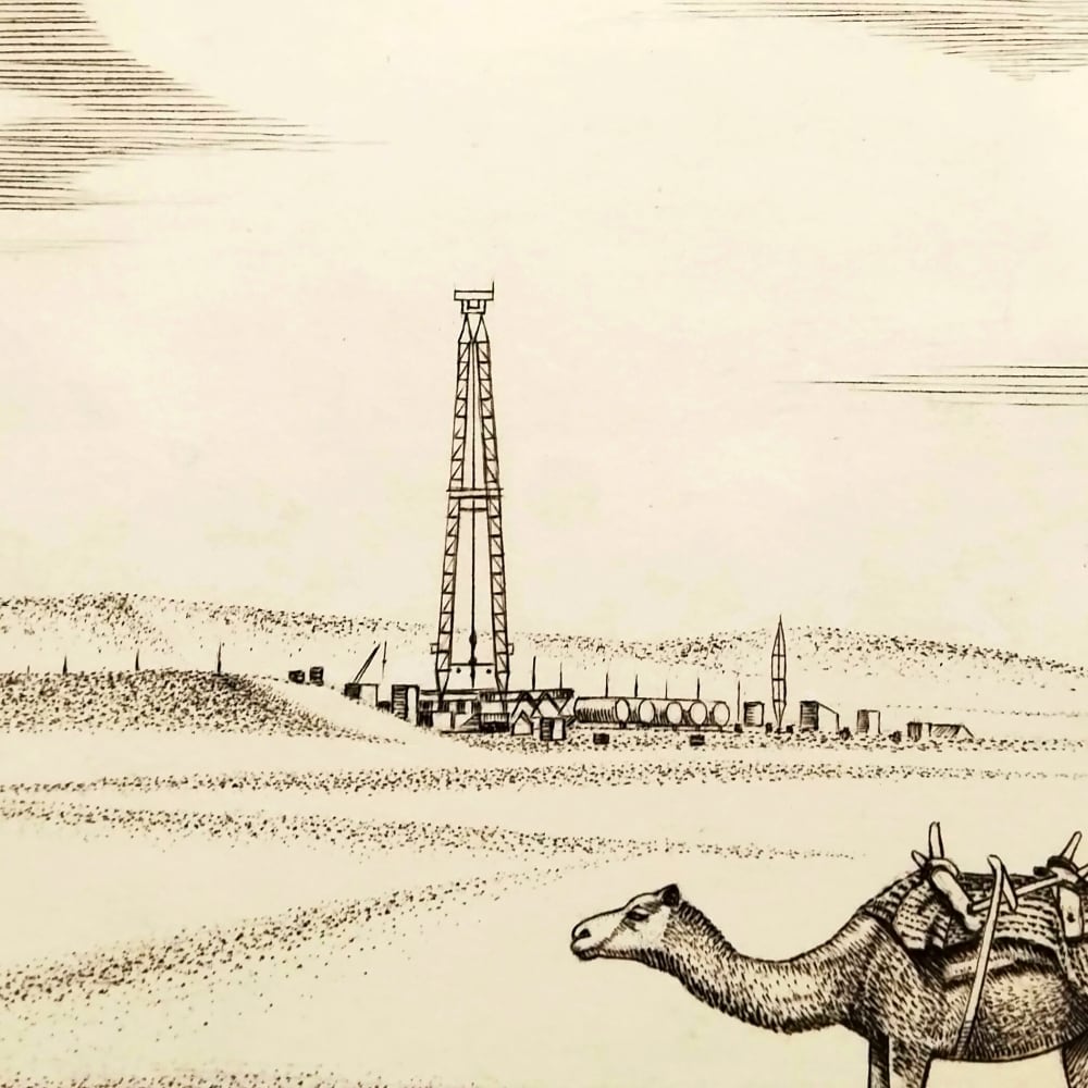 画面手前にはラクダに乗る二人の人物、遠景には石油を掘削するためのデリック(櫓)が高々とそびえています。