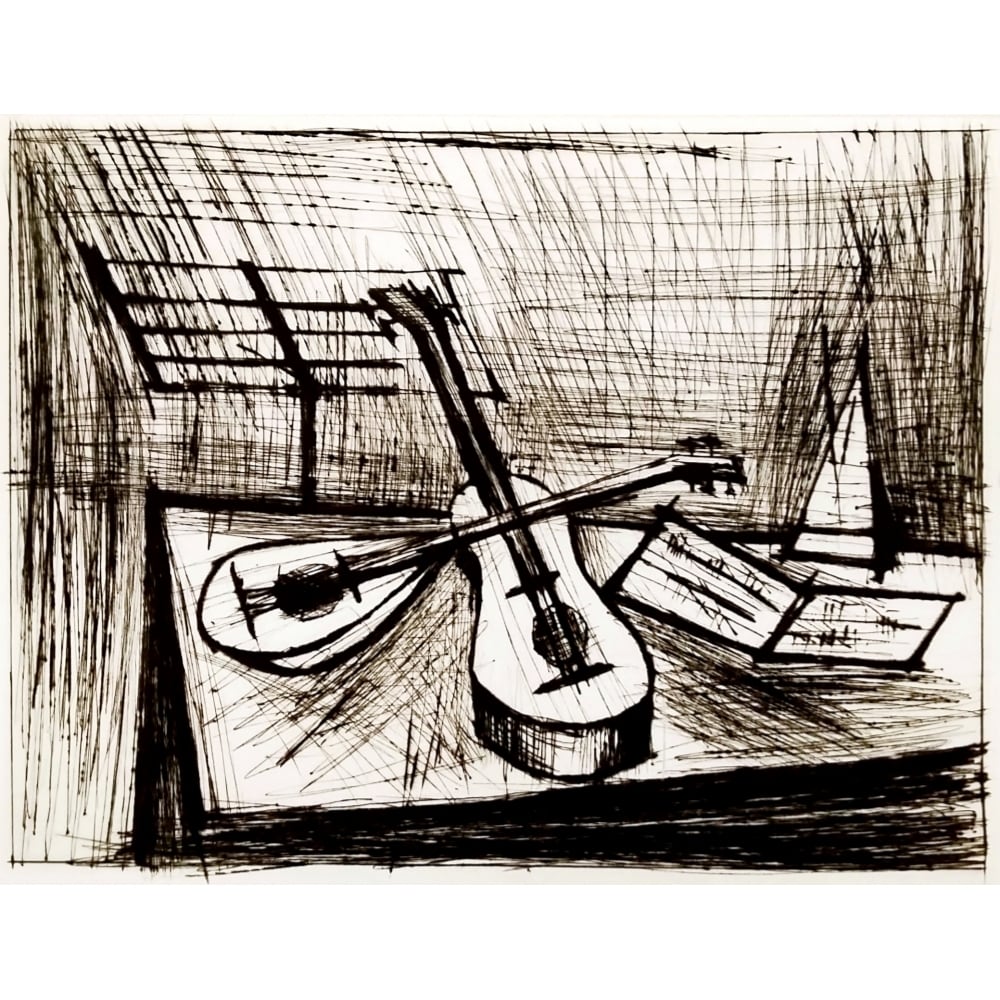 本作は、楽器のある卓上の風景を題材とした、1979年作の銅版画です。