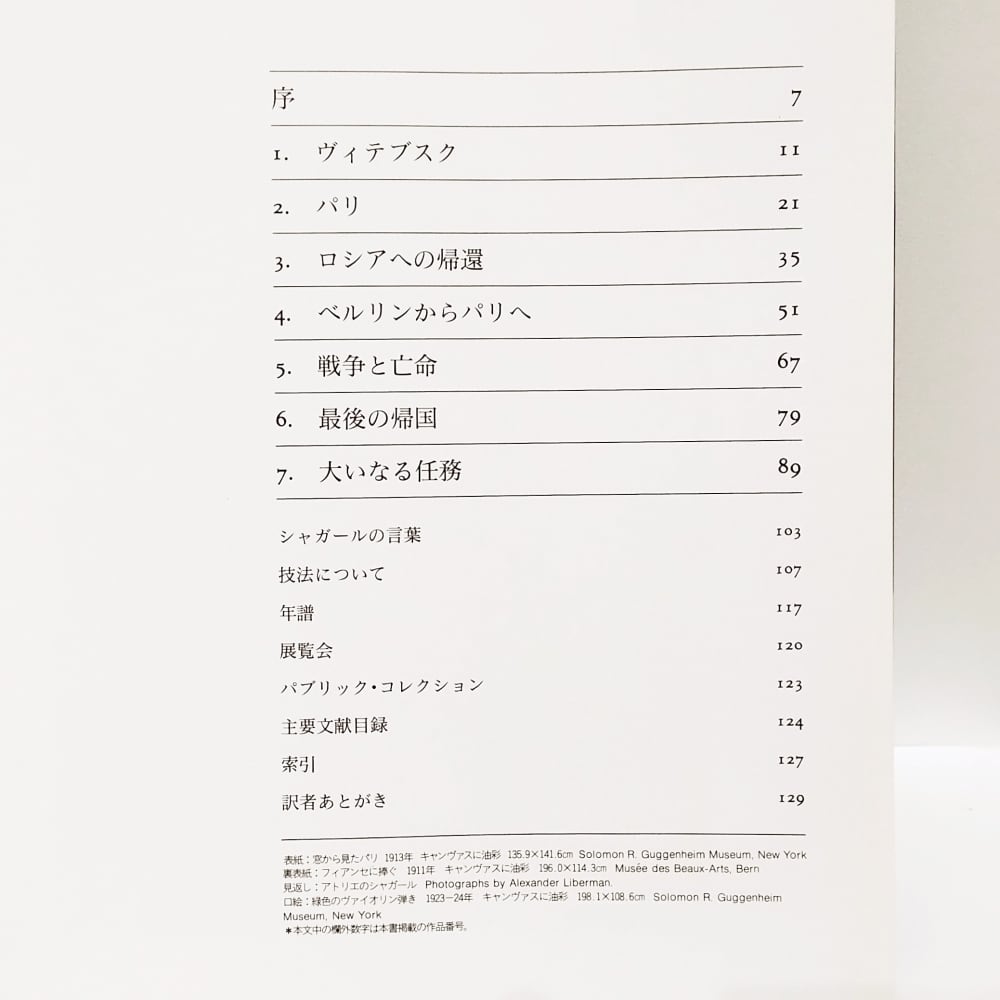 時代ごとに7つの章に分け、詳しい解説と多数のカラー・モノクロ図版でシャガールの画業を俯瞰する構成。