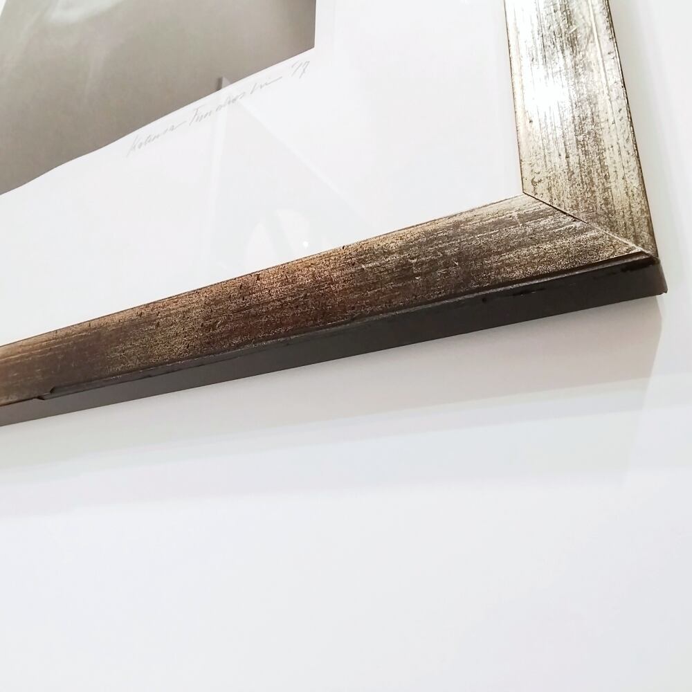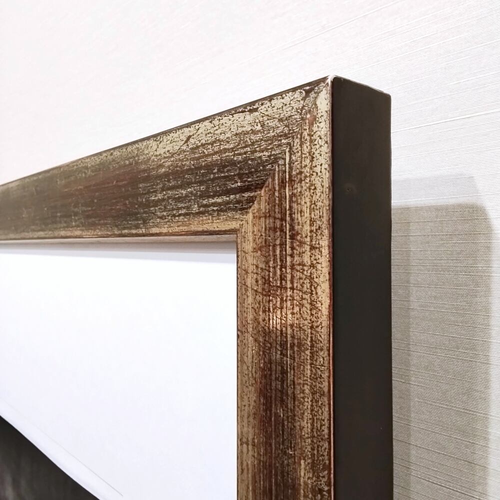 シルバーやブラウンなどのニュアンスの施された、幅4cm程のシャンパンゴールドの額に入っています。