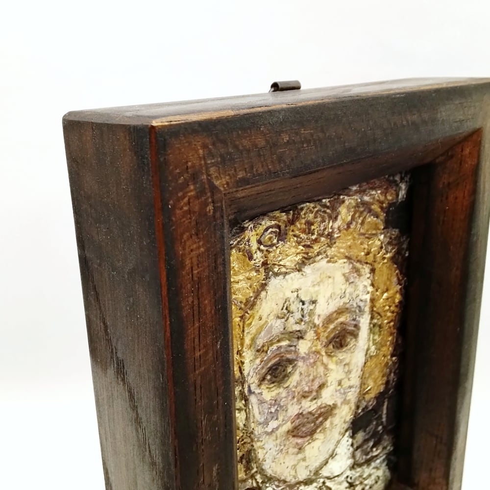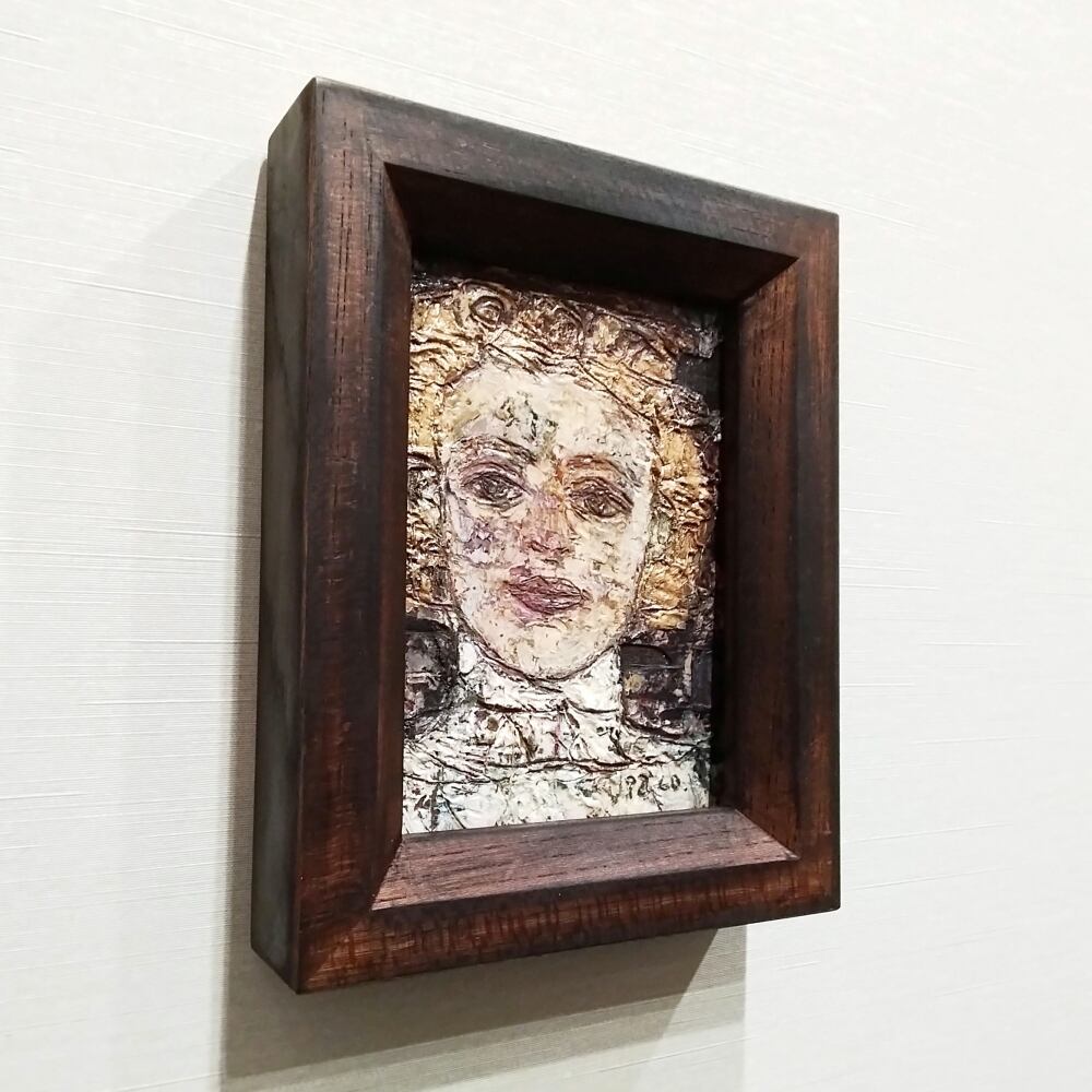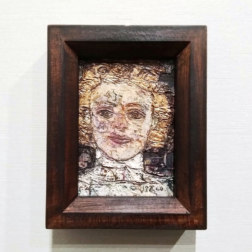 重厚なマチエールで描かれたイコン画風の肖像は、特定のモデルを持たないがゆえに普遍的で崇高です。