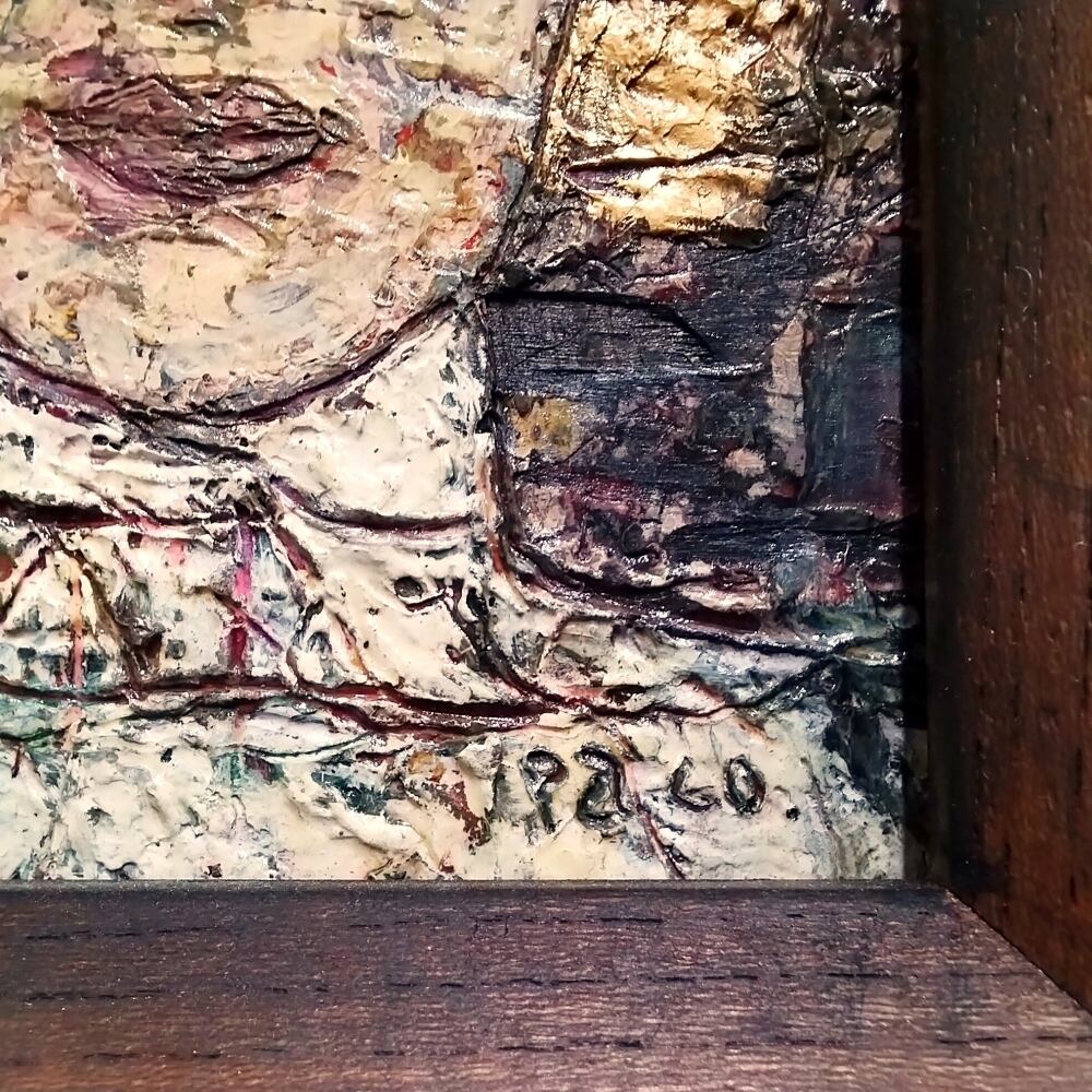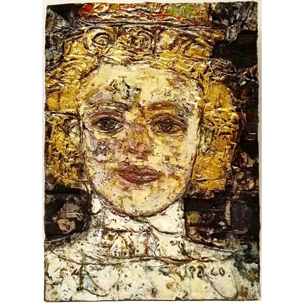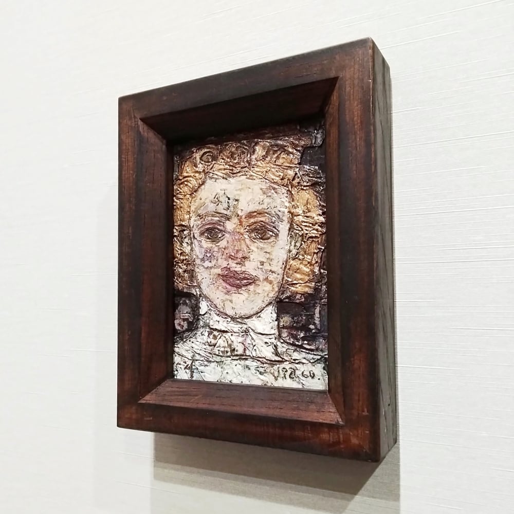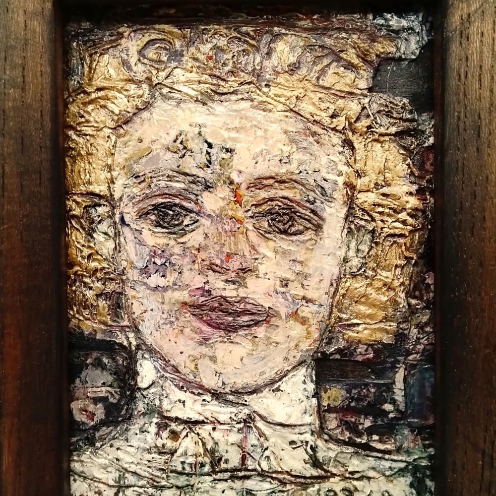 重厚なマチエールで描かれたイコン画風の肖像は、特定のモデルを持たないがゆえに普遍的で崇高です。