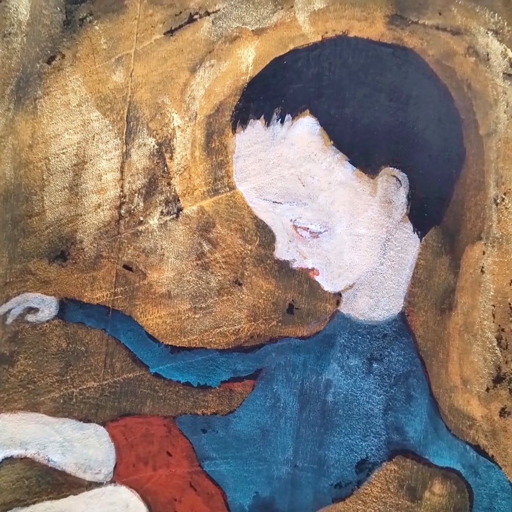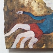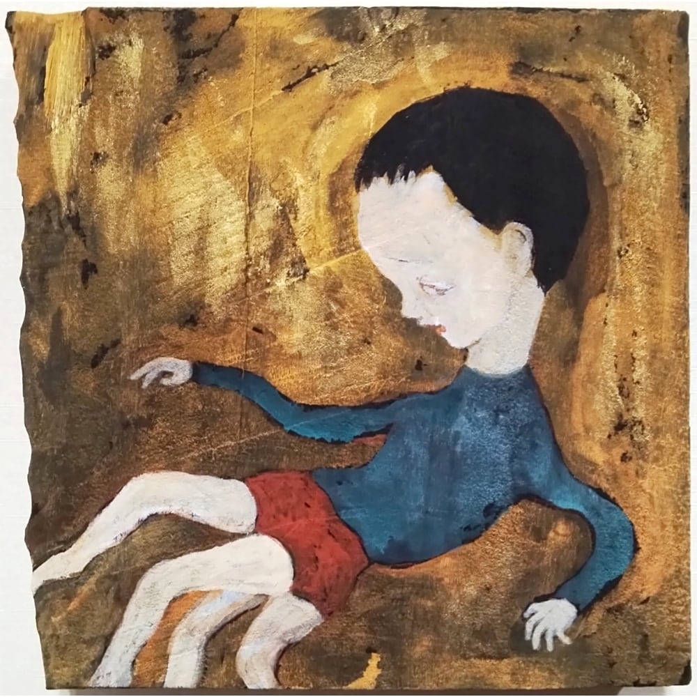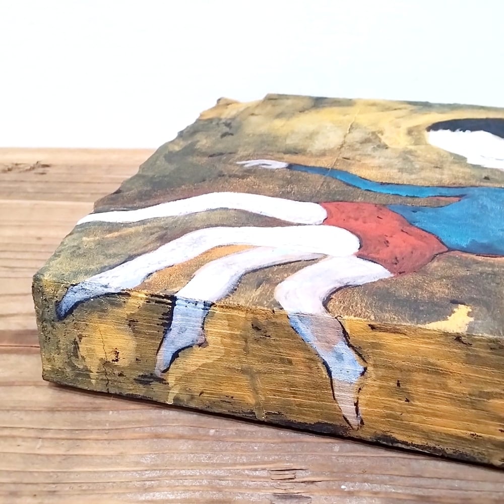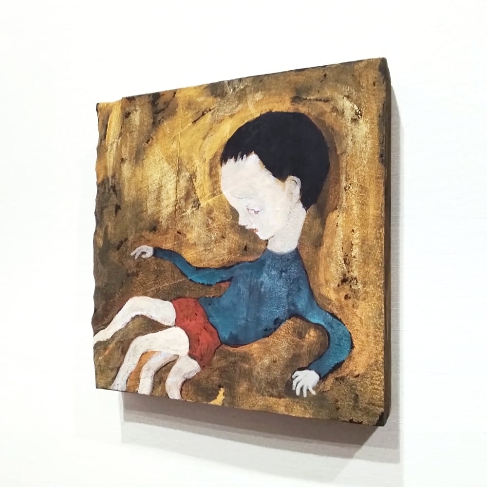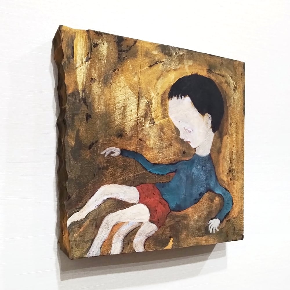 本作は、楠の板にアクリルガッシュで描いた作品です。