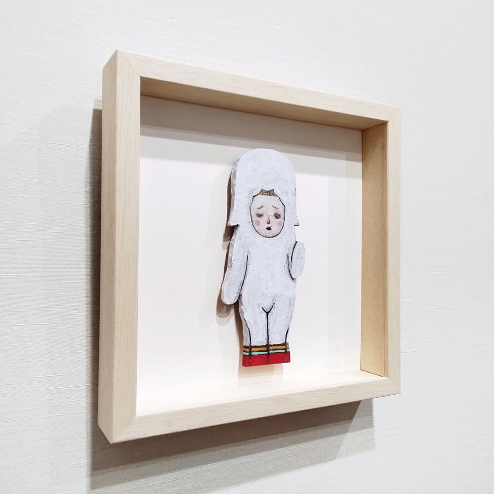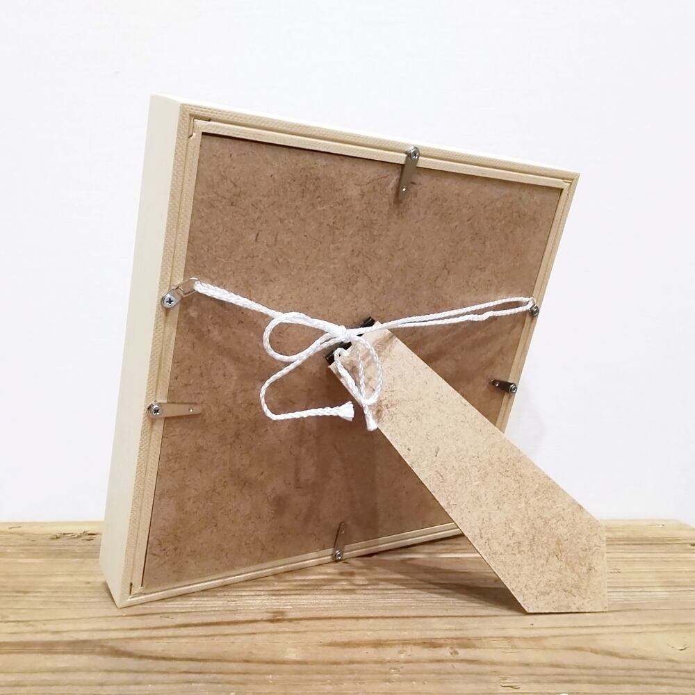幅1.4cmのシンプルな木製ボックス額に、作品を土台から少し浮かせる仕様でセットされています。