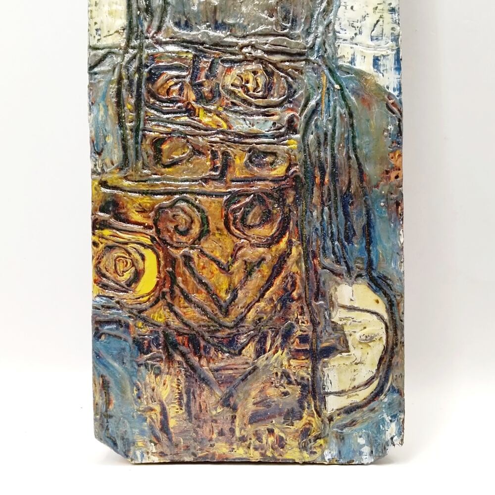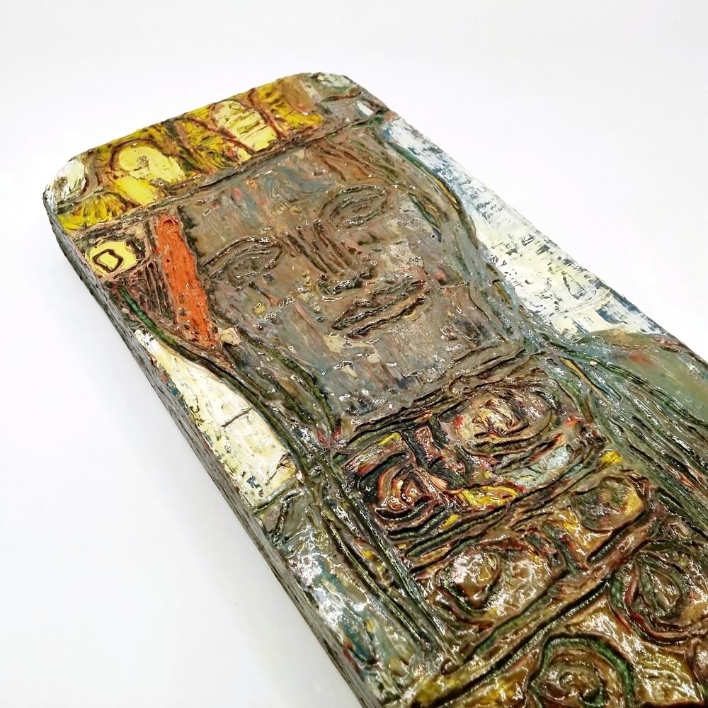 木材をクラフト染料と油性ペンキで着彩し、その上からハンダゴテで熱を入れて線刻を施すユニークな工程により、まるで長い年月を経た古物のような風合いが生まれました。
