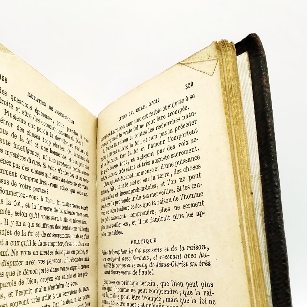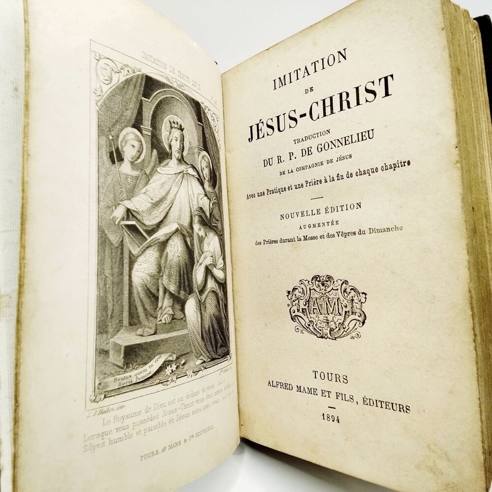 こちらは、1894年にフランスの都市・トゥールで出版された翻訳版で、『キリストに倣いて』の本文に加え、ミサや日曜日の夕べに唱える祈祷文が追加収録されています。