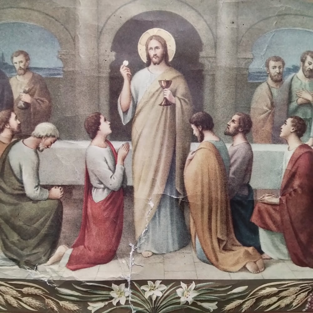 中央にはパンと杯を持つイエス・キリスト、その周囲に12人の使徒たちが集っています。