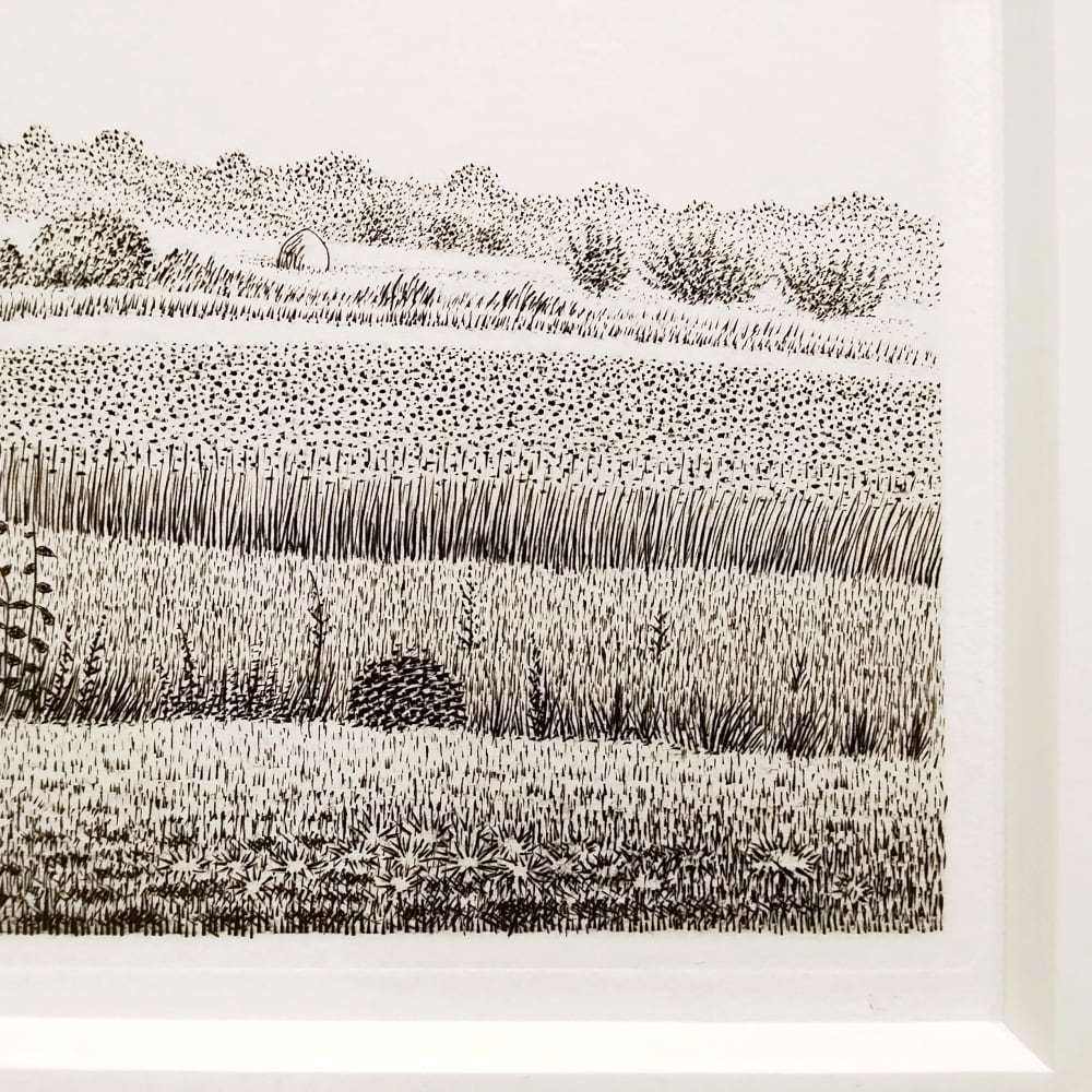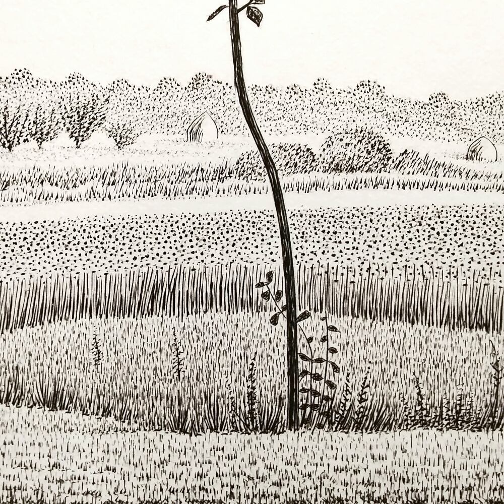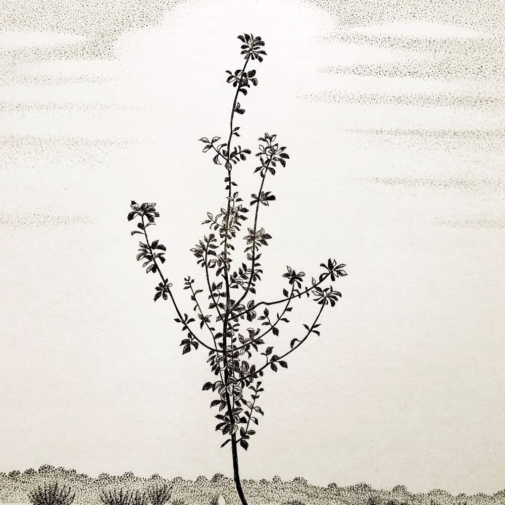 《若木》もまた、枝葉の優雅な曲線や大地を覆う草、遠景の木々に至るまで、実に繊細な線と点の集まりで表現されています。