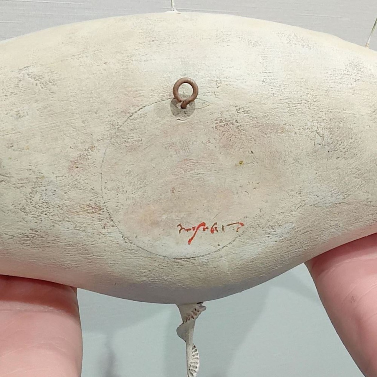 背面にリング状の金具が付いているので、細いピン等で壁掛けすることができます。