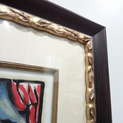 美しい彫りのあるゴールドとダークブラウンの額に、ベージュの布マットが合わせてあります。